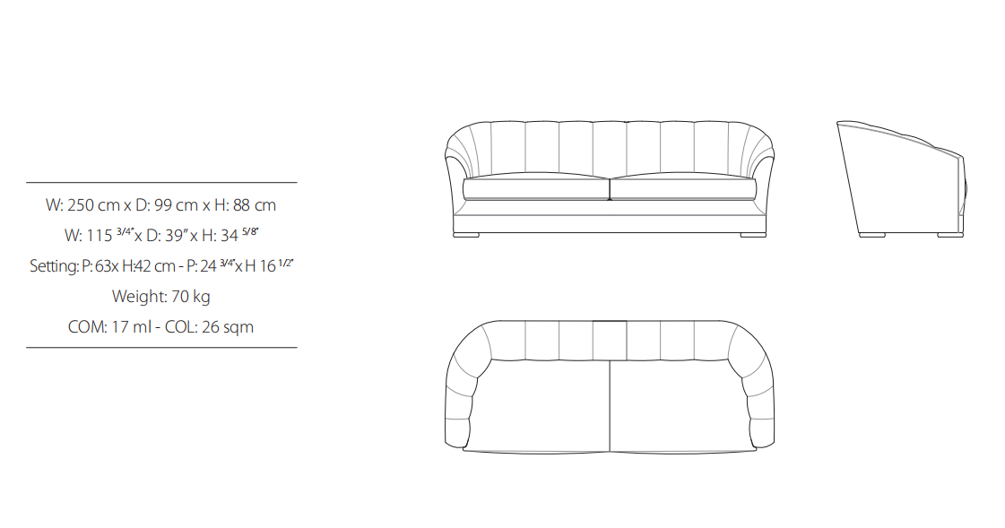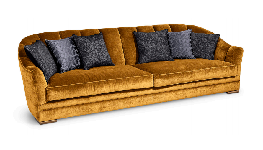 Sofa, frame made of solid timber and plywood. Variable densities polyurethane foam padding. Nr.1 pillow 50x50 cm and nr.1 pillow 50x35 cm in mixed feather. Skirting in antique bronze or antique finish distressed paint.