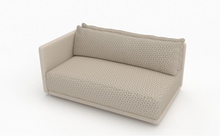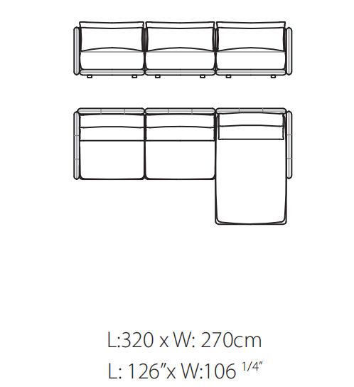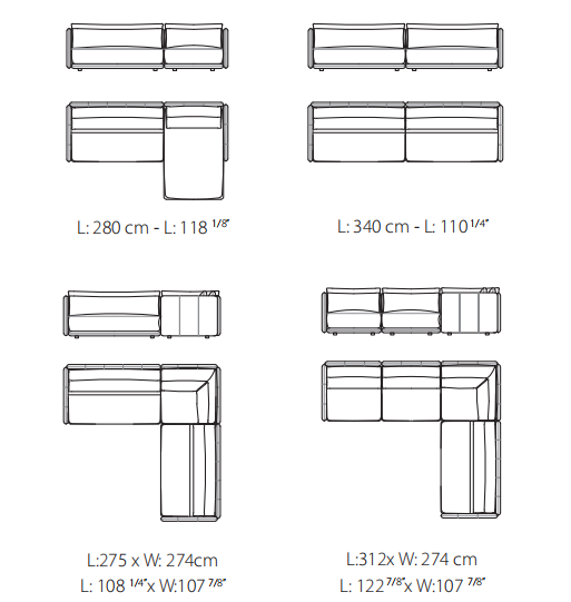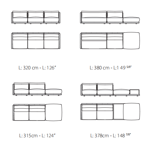 Sofa, frame made of solid timber and plywood. Variable densities polyurethane foam padding. Nr. 2 back cushions, doubled with nr.  2 cushions in the same size (total of 4). Black lacquered feet.
