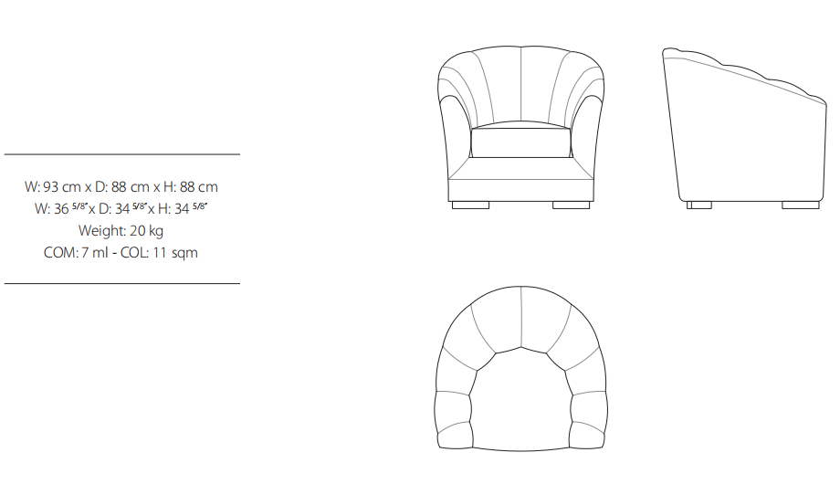 Armchair, frame made of solid timber and plywood. Variable densities polyurethane foam padding. Antique bronze or antique silver finish feet. Feather backrest recommended (refer to pillow section).