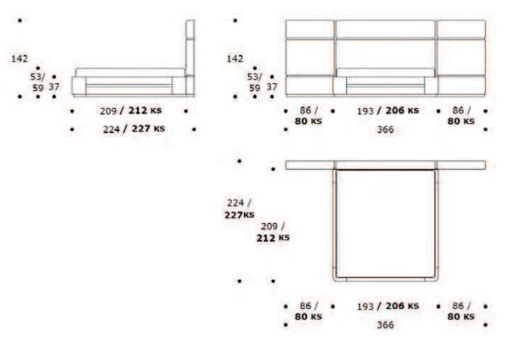 Dimensioni: larghezza 366 cm, altezza 142 cm, profondità 224 cm.