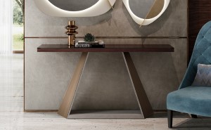 Consolle in essenza palissandro opaco o tabacco opaco, base in acciaio brunito spazzolato e pelle.