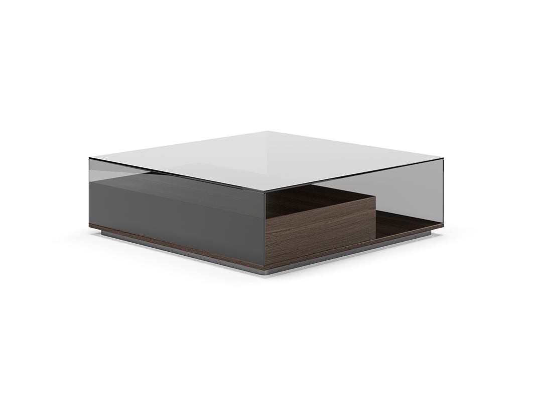 TAVOLINO SERVETTO QUADRATO IN CRISTALLO, CONTENITORE IMPIALLACCIATO ROVERE GRIGIO, BASE IN TITANIO SATINATO