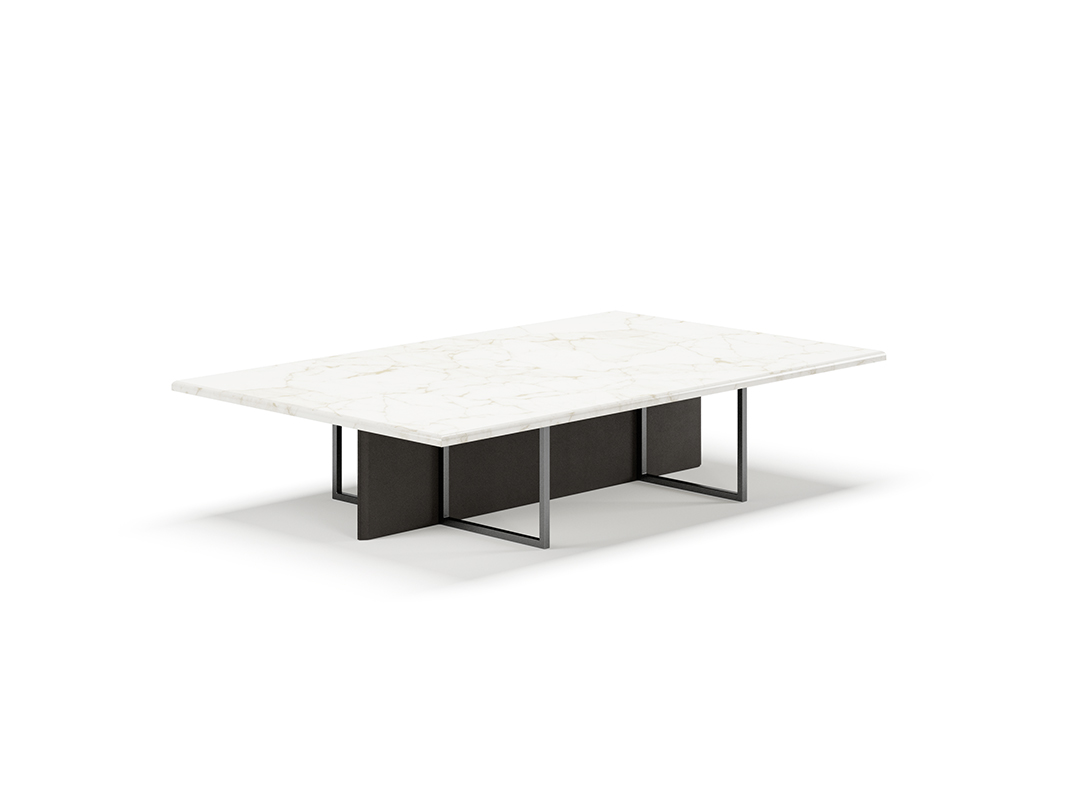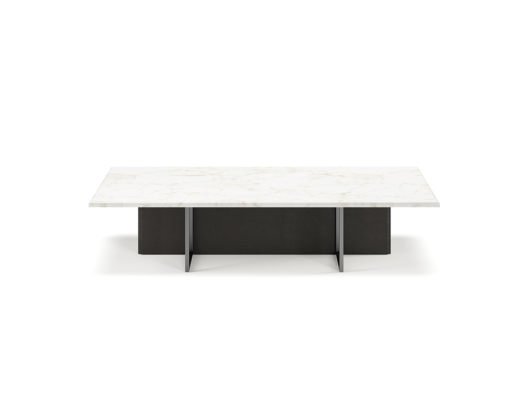 TAVOLINO SERVETTO BASSO RETTANGOLARE,TOP IN MARMO, GAMBA TRASVERSALE IN PELLE CON TELAI IN METALLO