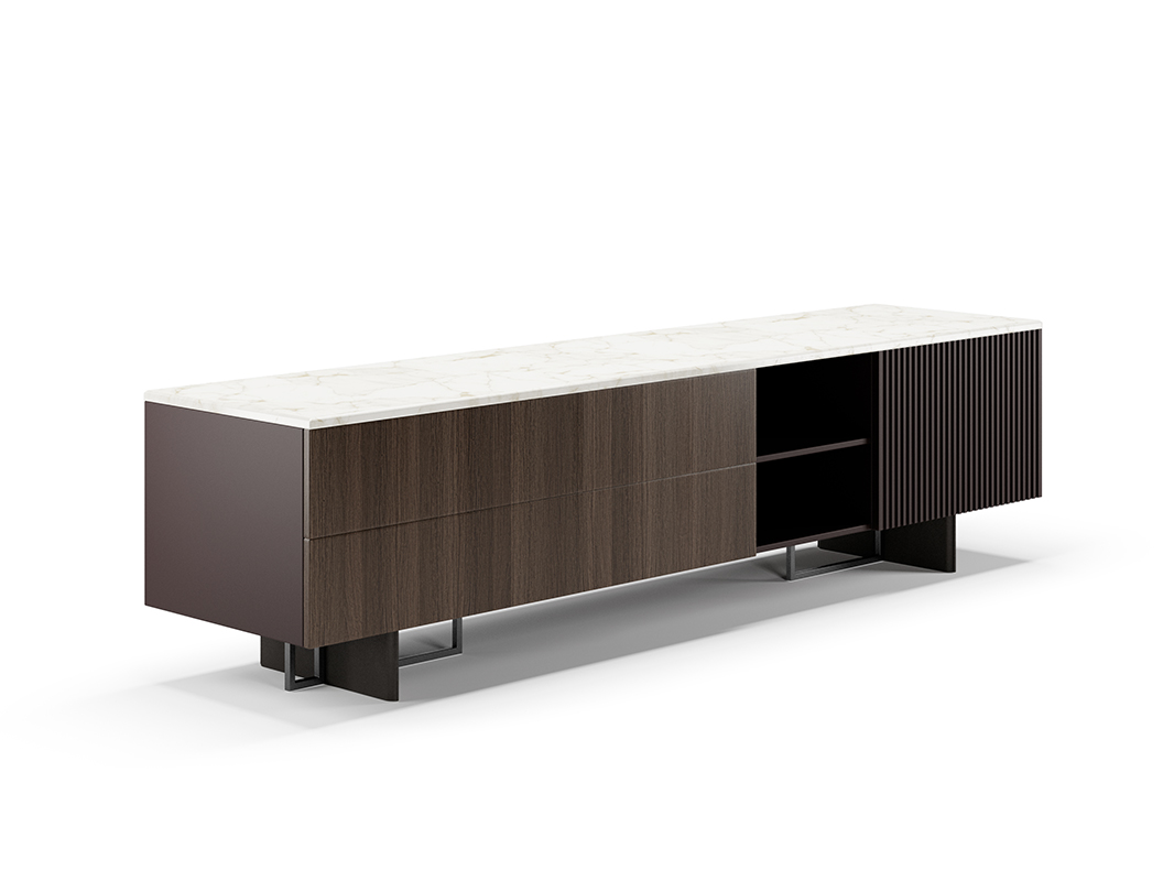 MADIA BASSA CON CASSA IMPIALLACCIATA ROVERE GRIGIO,ANTA LACCATA FRESATA, 2 CASSETTI PUSH-PULL,TOP IN MARMO, GAMBA CON TELAIO FINITURA TITANIO SATINATO E PANNELLO IN PELLE