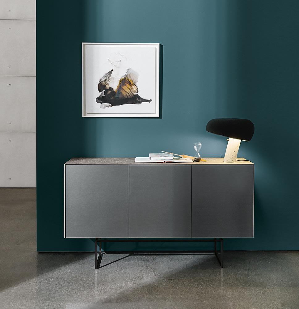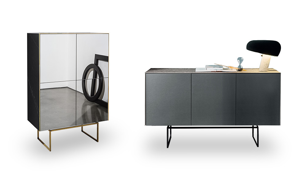 Magda è una nuova collezione di madie che unisce la matericità e le morbide venature della ceramica effetto marmo alle preziose e affascinanti tonalità di specchio Sovet.
