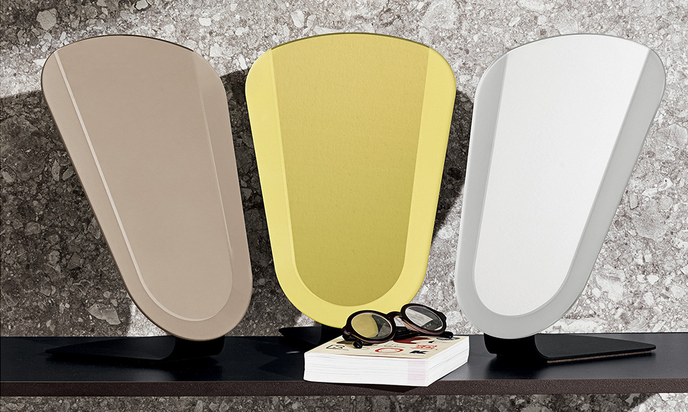Specchio da tavolo con bordo acidato, disponibile in diverse tonalità di specchio. Struttura in metallo con finitura nero goffrato.