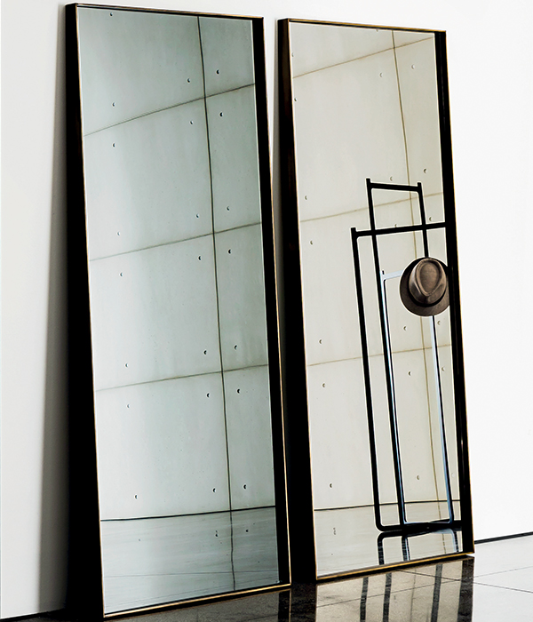 Specchiera rettangolare con telaio in metallo laccato nelle finiture ottone brunito o caffè, disponibile per attacco verticale/orizzontale o con appoggio a terra. Specchio centrale disponibile in varie tonalità.