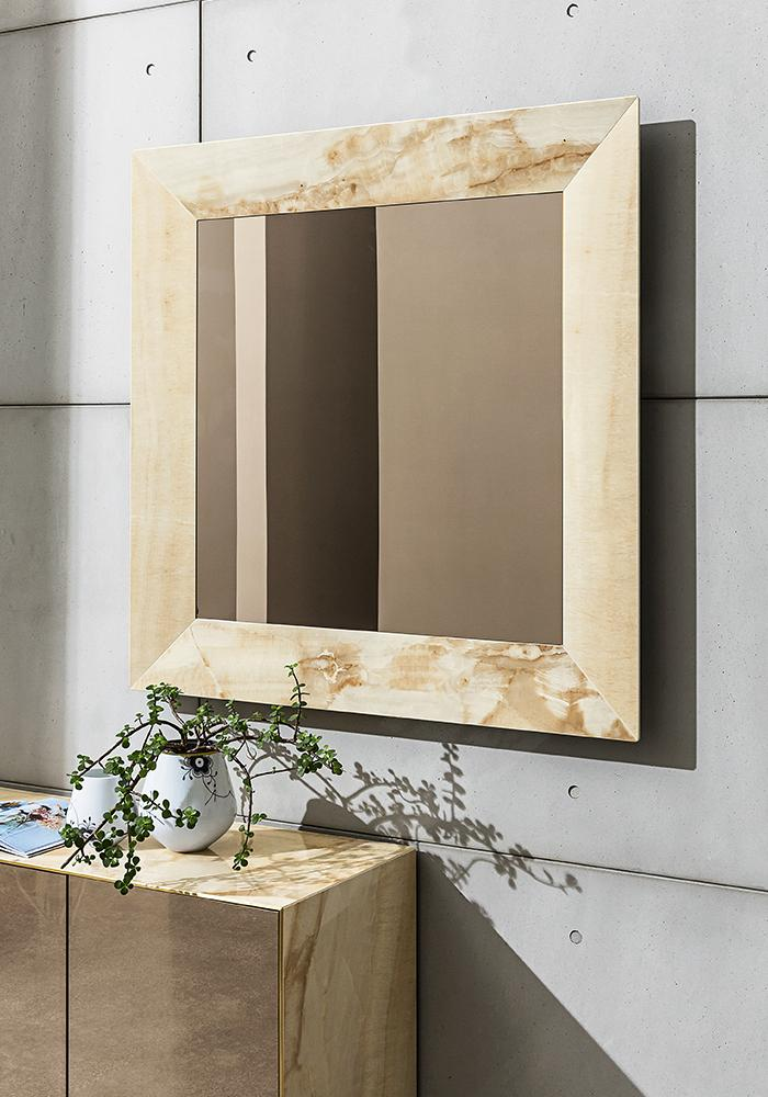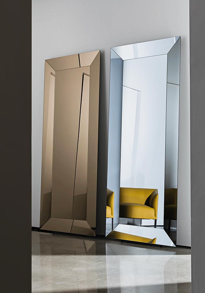 Specchiera con telaio in alluminio per attacco verticale/ orizzontale o con appoggio a terra. Specchio centrale disponibile nelle finiture extrachiaro, fumé o bronzo. Cornice perimetrale disponibile in vetro laccato, specchio o ceramica, varie finiture. Optional: retroilluminazione a led.