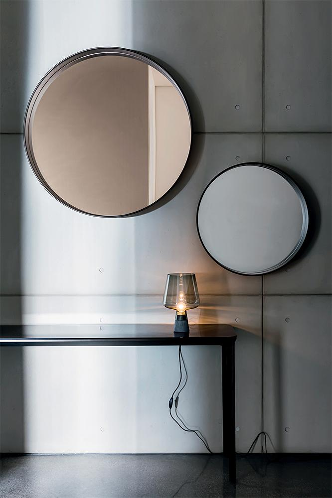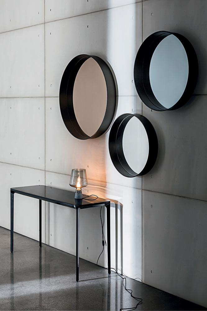 La superficie riflettente è disponibile con un’acidatura che disegna un orizzonte visivo, giocando con la luce e le proporzioni. Le diverse dimensioni disponibili e l’attacco a parete orientabile consentono di creare diverse situazioni e composizioni. La cornice è proposta in due profondità ed in quattro finiture laccate (caffè, creta, bianco e nero), abbinabili a specchi con finitura argento, fumè o bronzo. Una molteplicità che si presta a dare vita a svariate soluzioni, ampliando gli orizzonti d’arredo dello spazio domestico o collettivo
