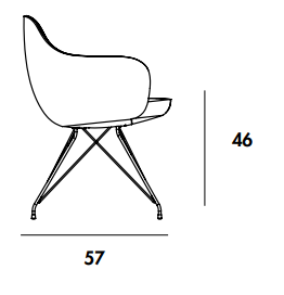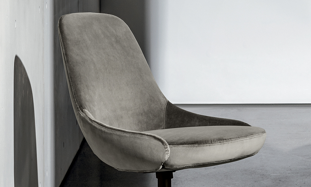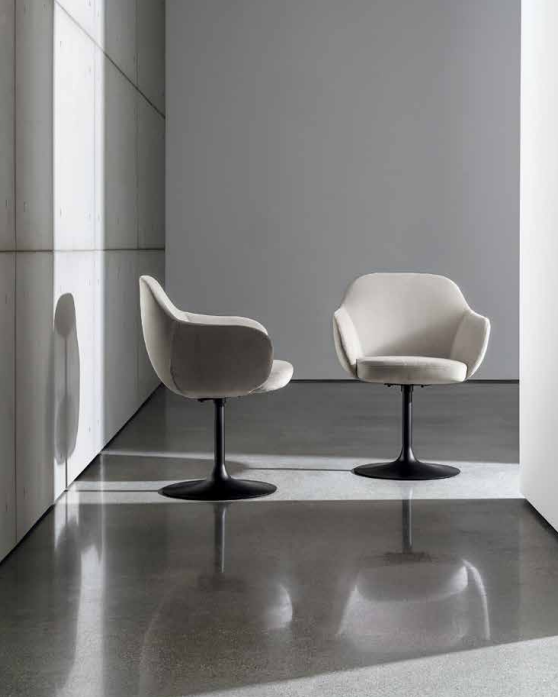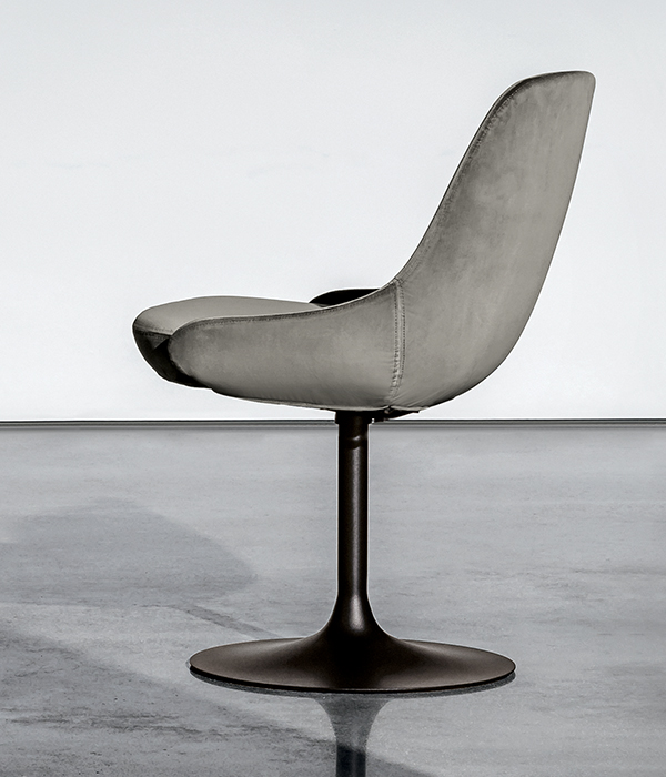 Sedia/poltroncina con base girevole in metallo laccato, varie finiture. Scocca rivestita in vari materiali e finiture.