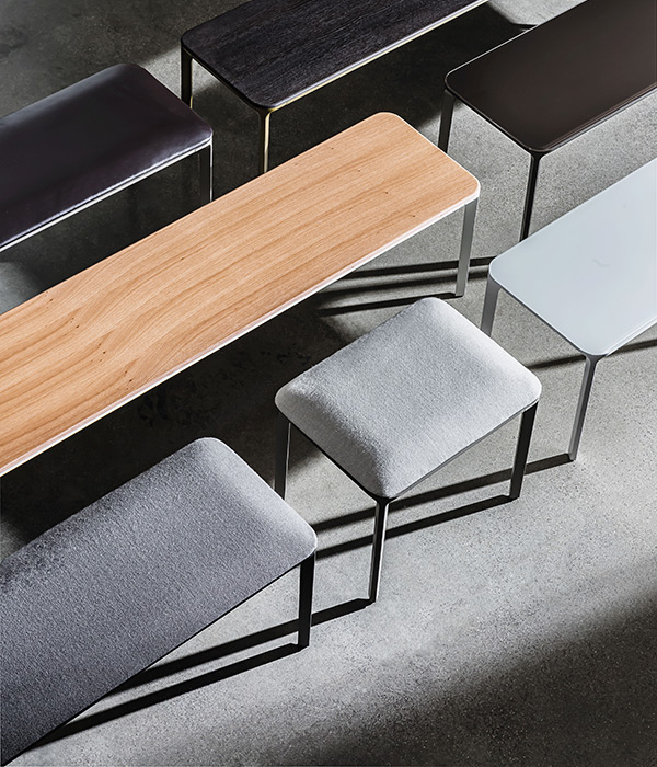 Panca con gambe in alluminio pressofuso cromato o verniciato, varie finiture, e struttura con profilo in alluminio anodizzato o verniciato, varie finiture. Seduta in legno o rivestita in tessuto KVADRAT, pelle, ecopelle o ecopelle Nabuk.