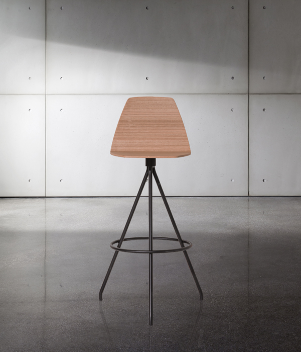 Sgabello con monoscocca in multistrato di legno disponibile nelle finiture: noce Canaletto, rovere naturale o tinto wengé. Gambe in metallo verniciato goffrato, varie finiture.