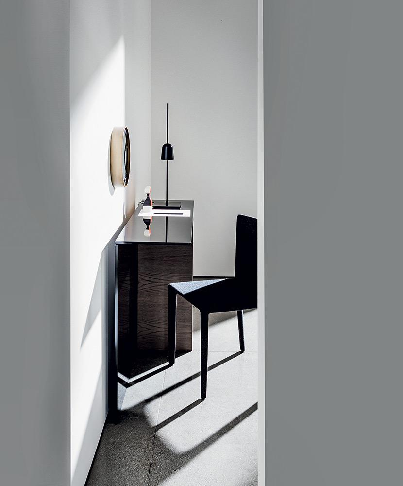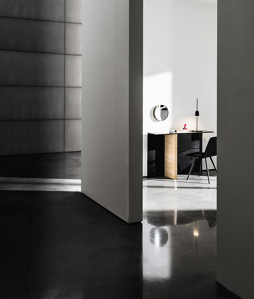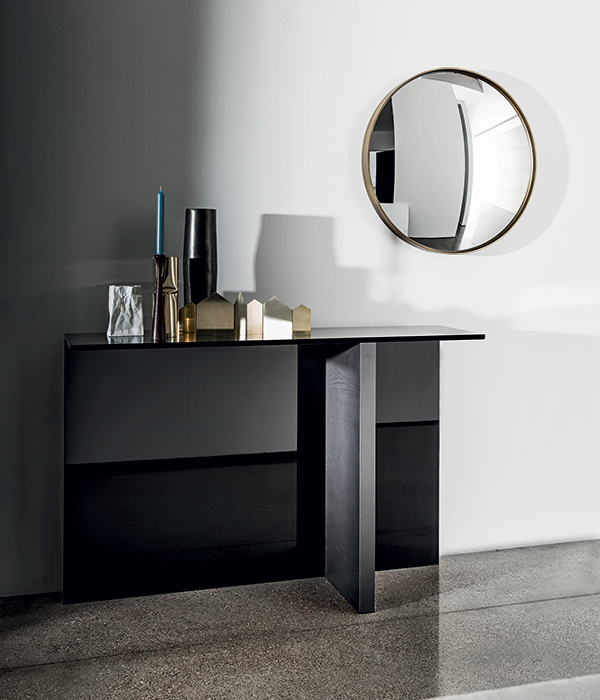 Consolle con top in vetro stratificato fumé. Base composta da un elemento in legno disponibile in varie finiture e un elemento in vetro laccato nero.