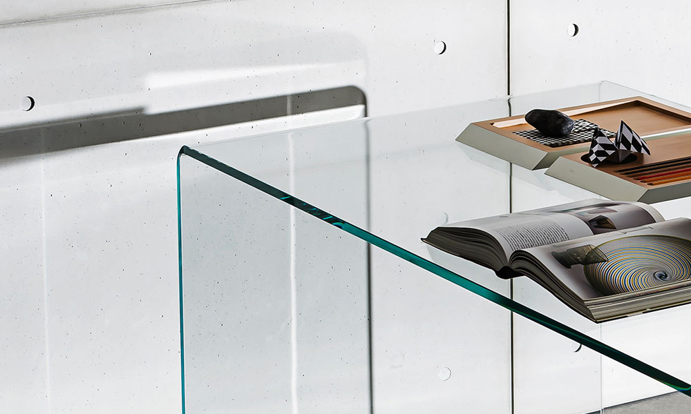 Tavolo / scrivania in vetro curvato trasparente extrachiaro o laccato mono o bicolore, vari colori.