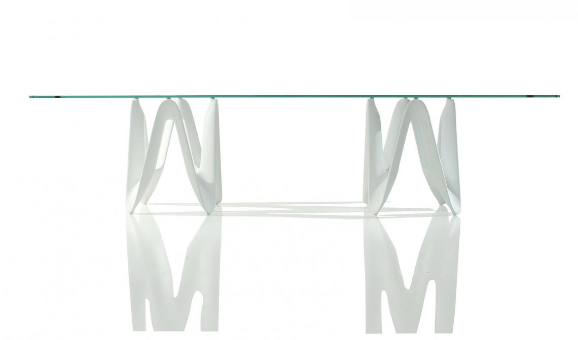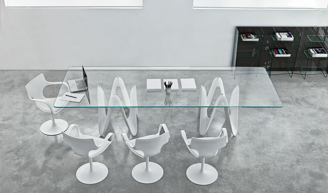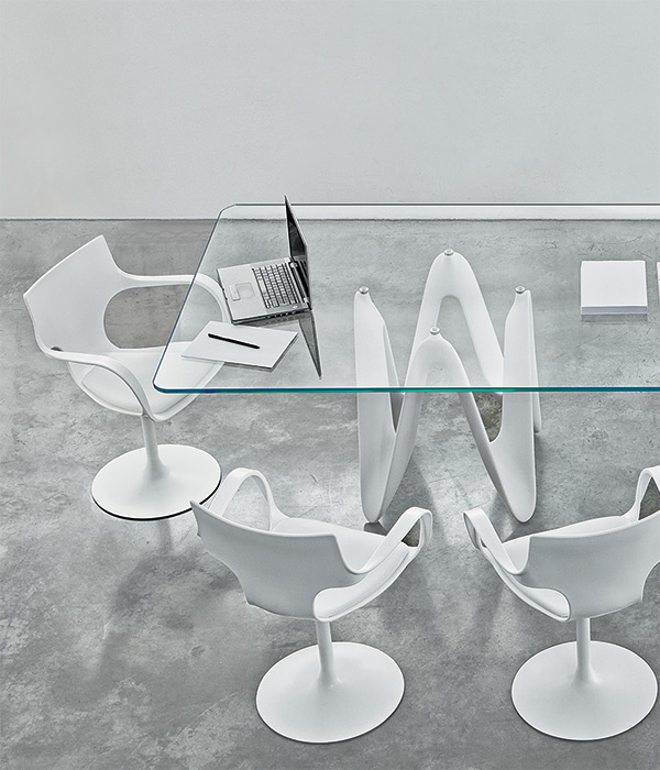Tavolo con basi in cristalplant bianco opaco, nero o in legno di frassino con fi nitura tinto rovere o wengé o in legno massello noce canaletto. Top in vetro temperato trasparente extrachiaro o in vetro stratifi cato 8+8 mm fumé.