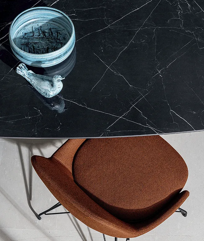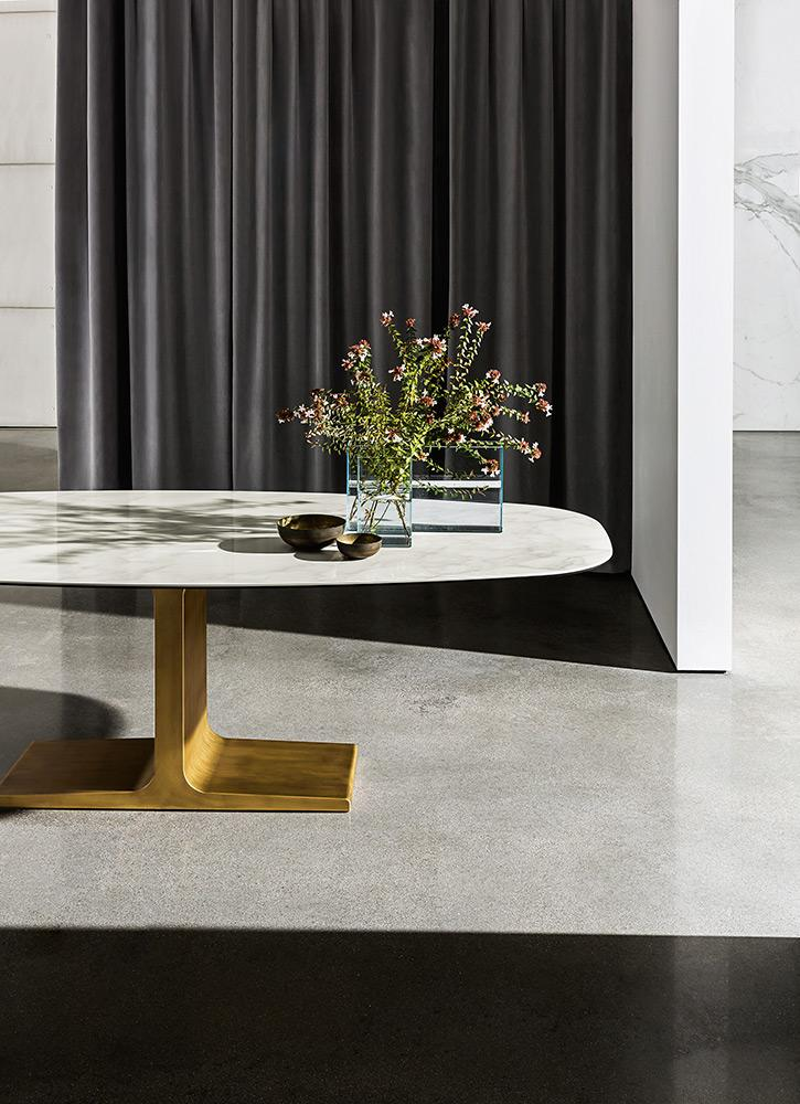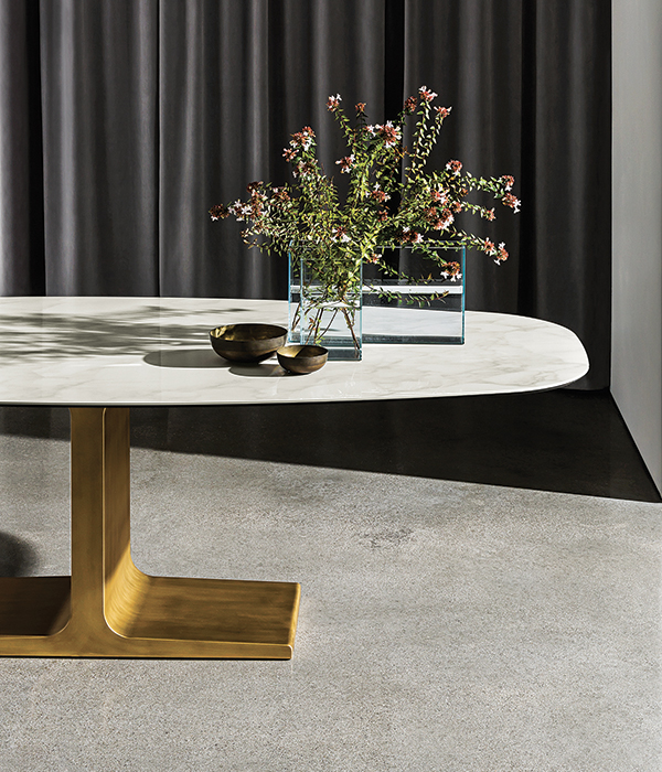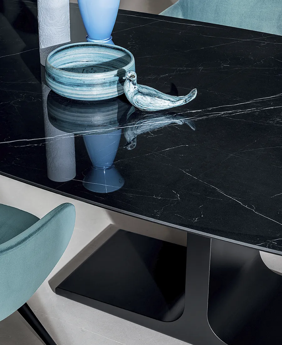 Tavolo con base in inox satinato, metallo laccato varie finiture o brunito. Top in vetro temperato laccato, legno o ceramica, varie finiture