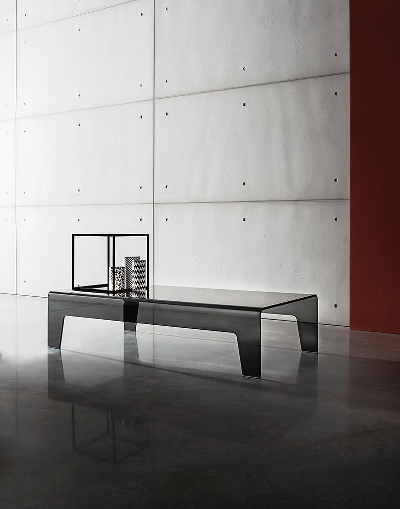 Tavolino in vetro curvo extrachiaro trasparente o laccato mono o bicolore. Nella versione rettangolare disponibile anche in vetro fumé.