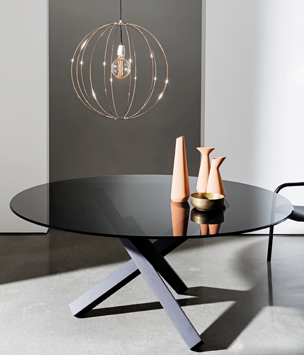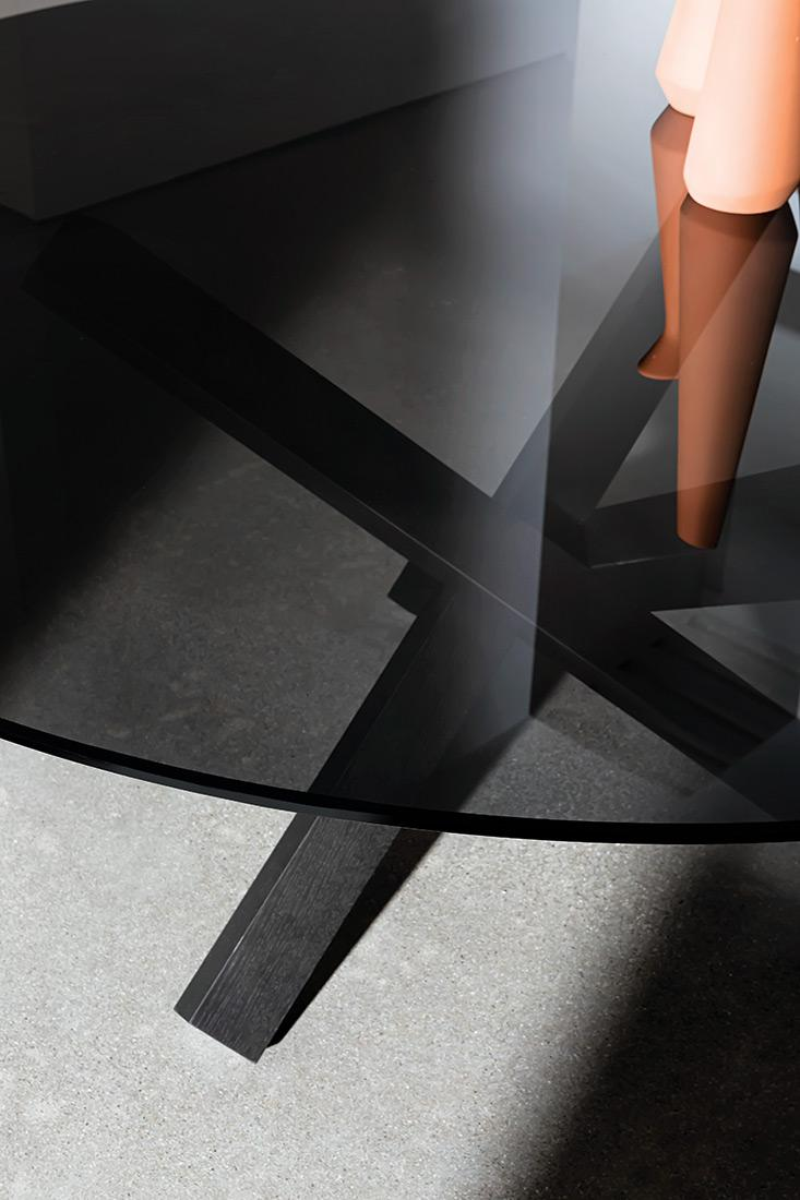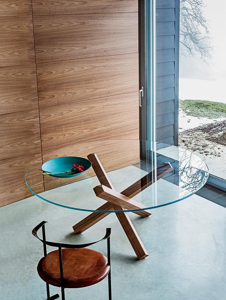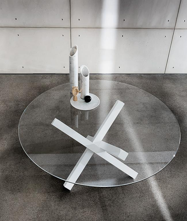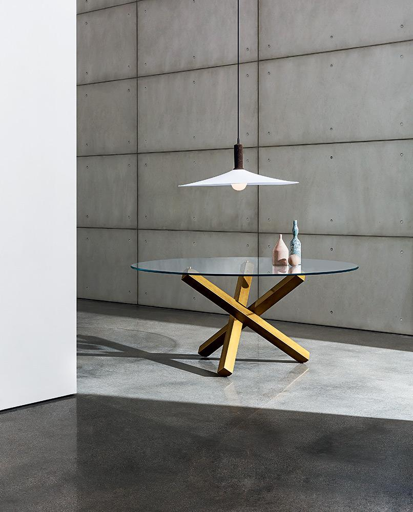 Tavolo con base in legno, varie finiture, o in metallo cromato lucido, laccato o brunito. Top in vetro temperato o legno, varie finiture. Top disponibile anche nell’esclusiva finitura Liquid Glass.