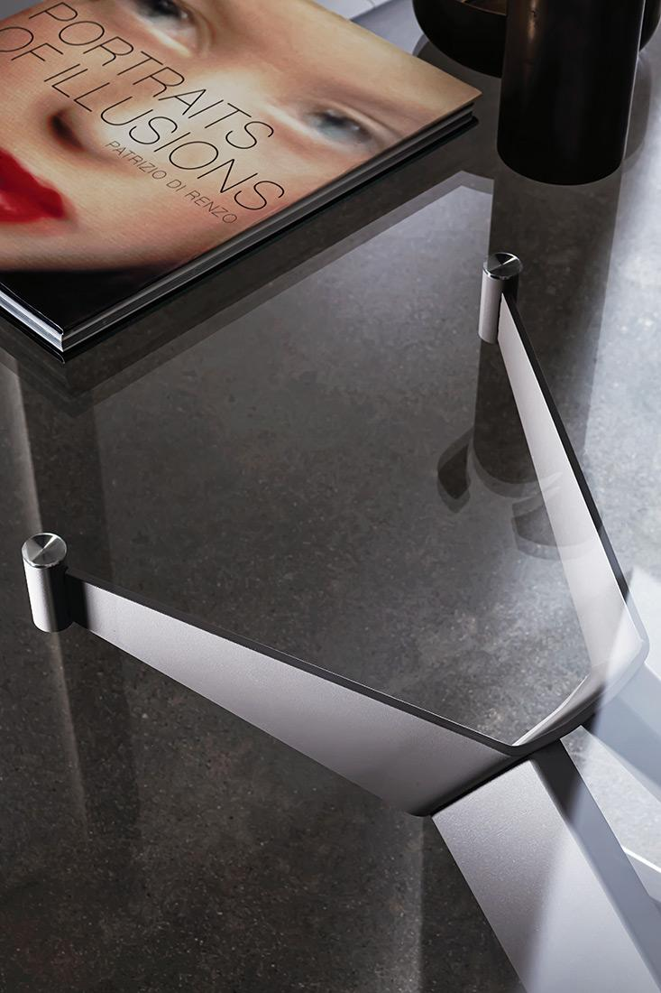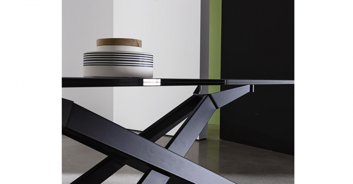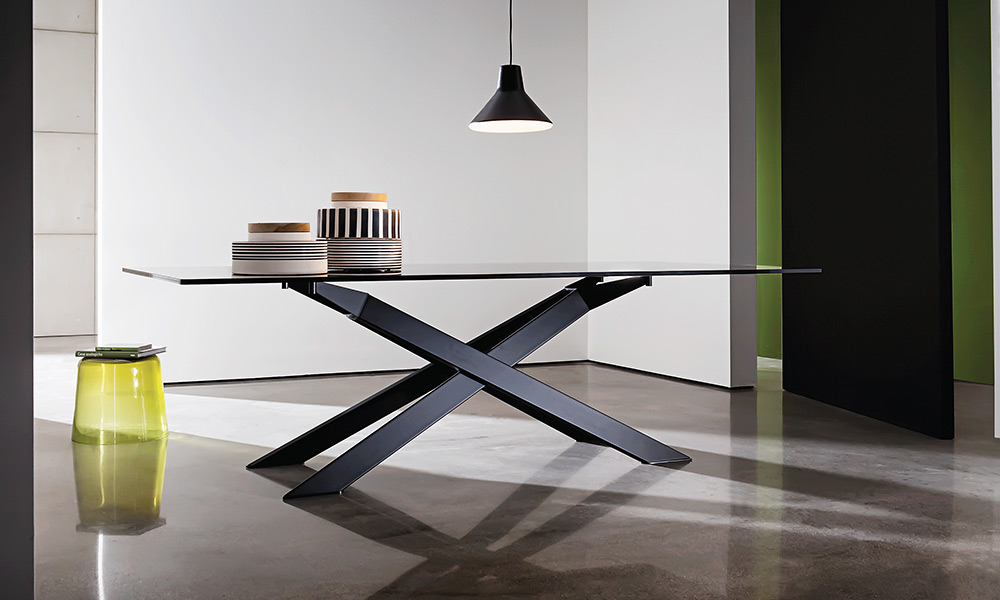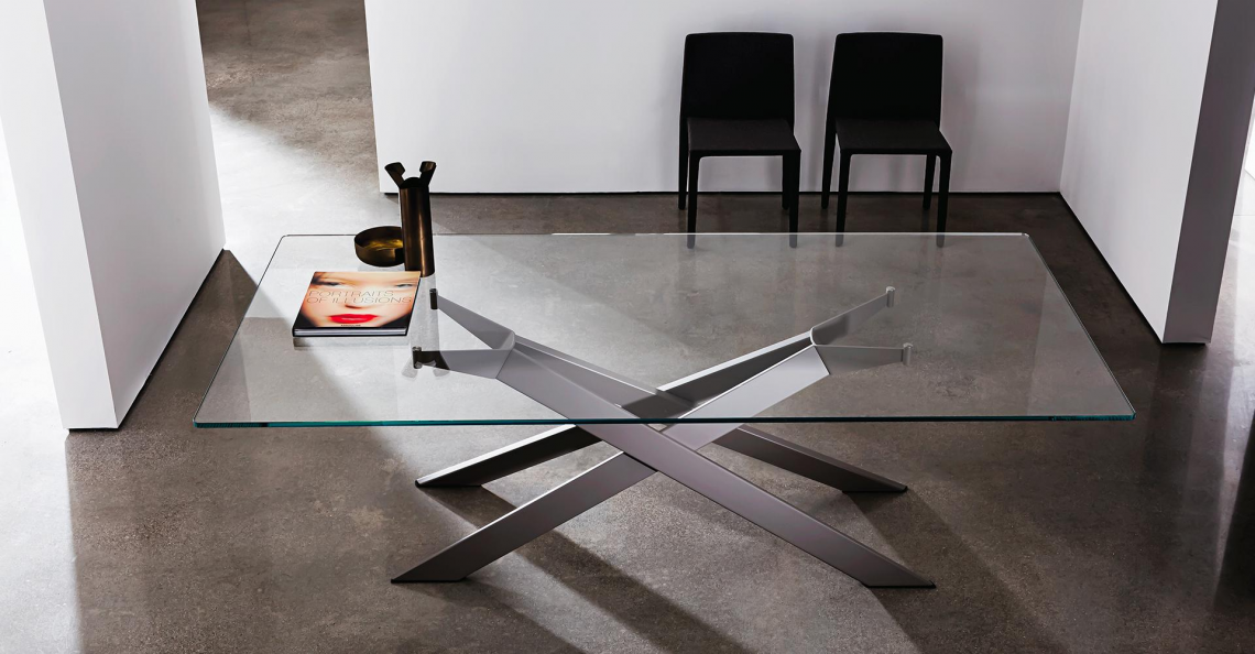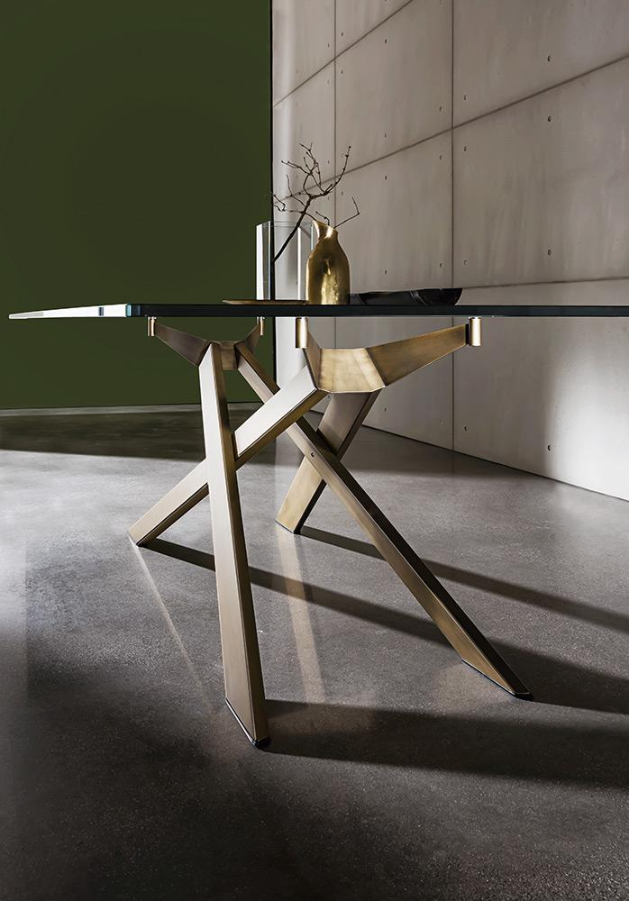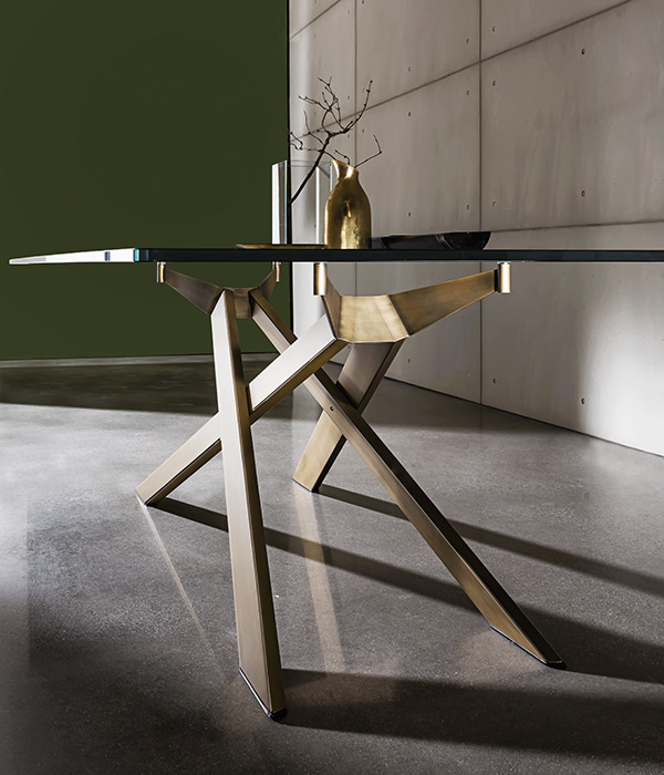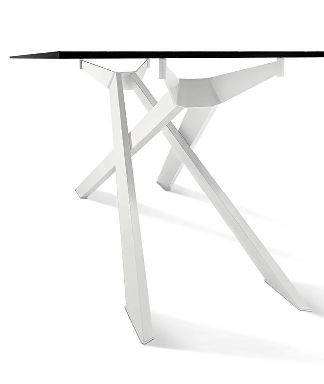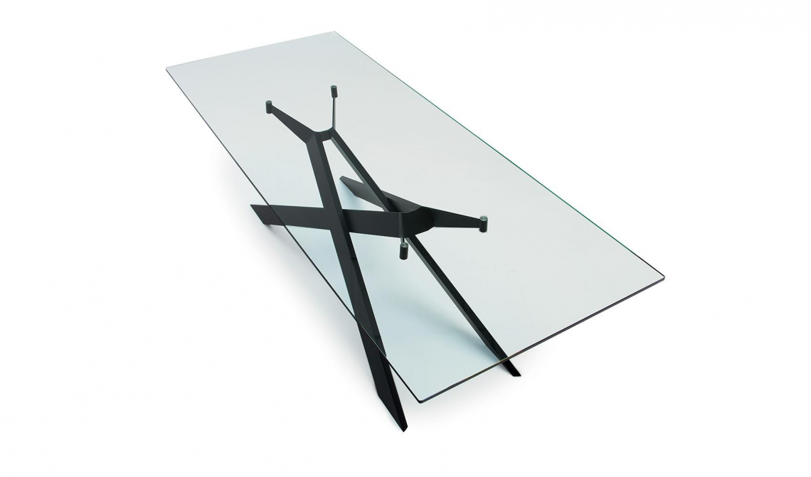 Tavolo con struttura in metallo verniciato disponibile in varie finiture. Top in vetro temperato nelle versioni trasparente extrachiaro e acidato. Nella versione cm 240x120 top stratificato 8+8 mm disponibile nelle finiture fumé e bronzo. Top disponibile anche in multistrato di legno di betulla finlandese, spessore 24 mm, impiallacciato in varie essenze.