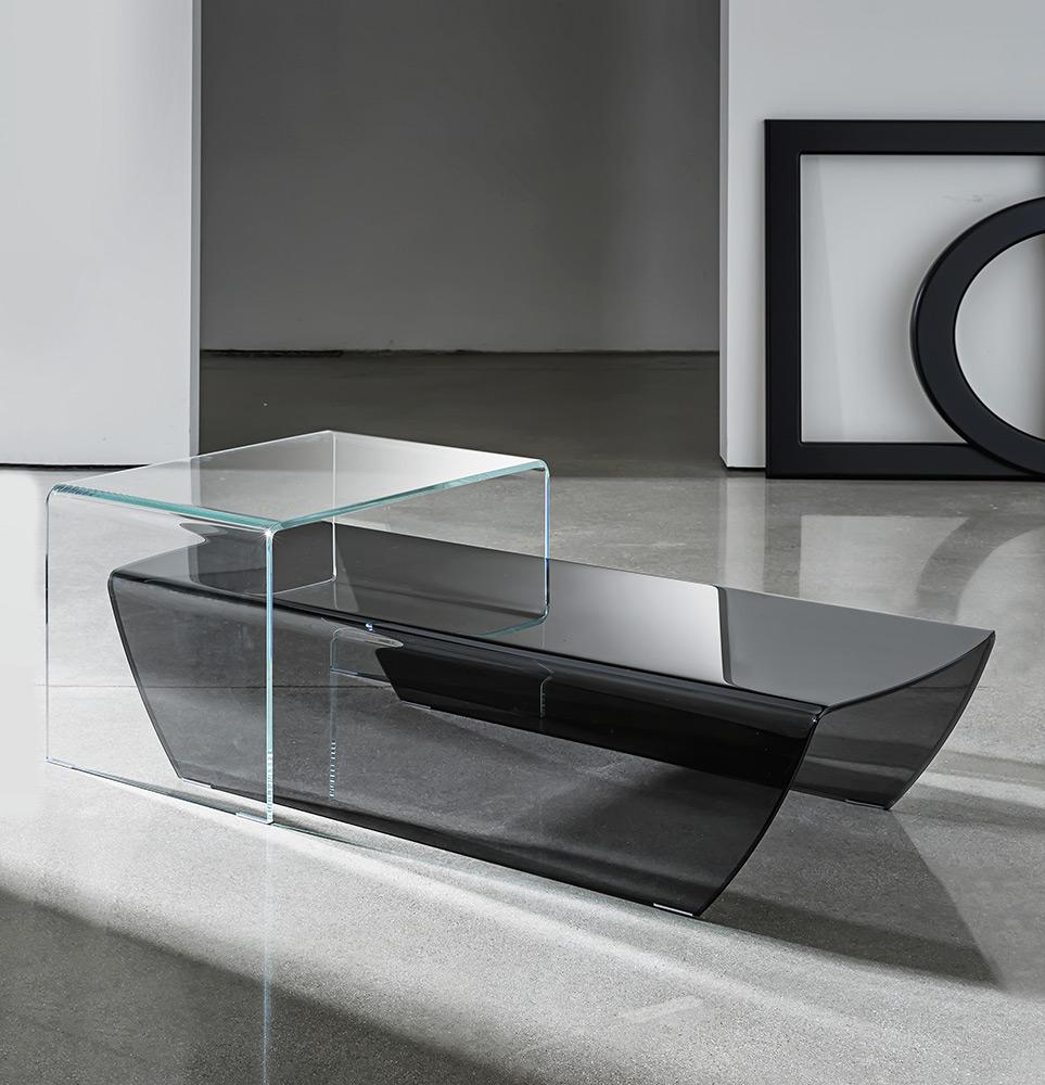 Tavolino in vetro curvo trasparente extrachiaro, fumé o laccato mono o bicolore.