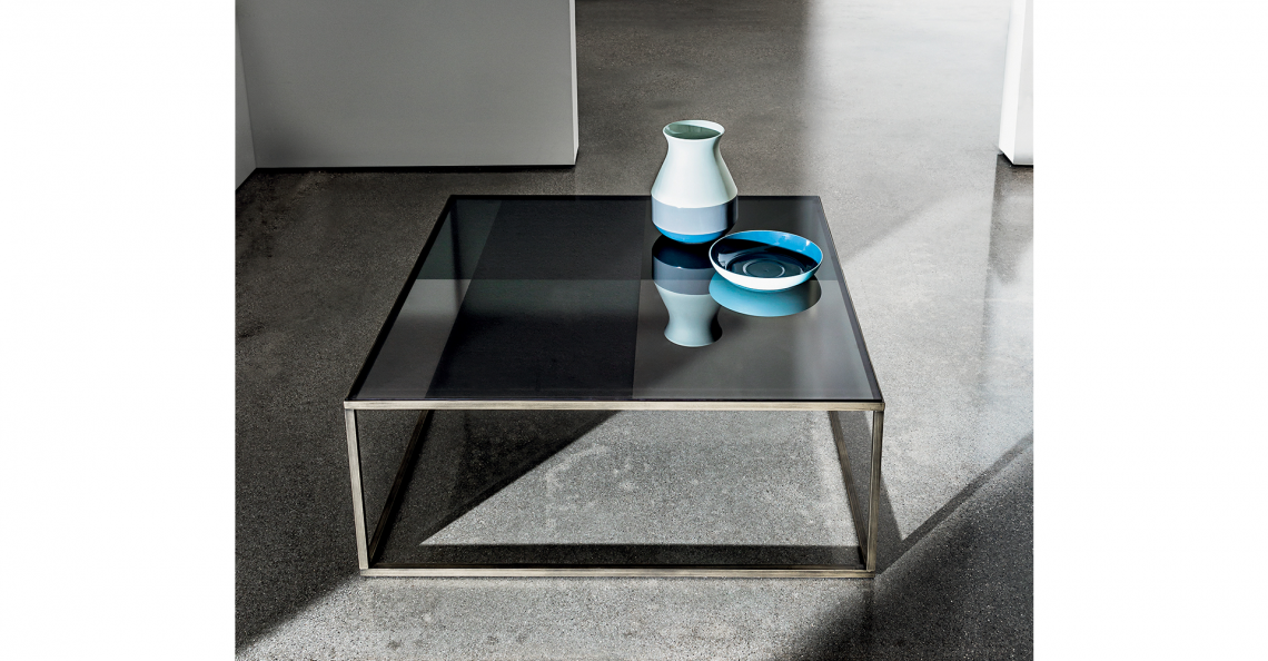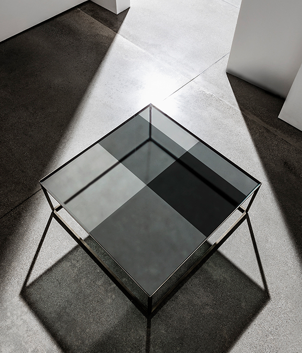Tavolino quadrato con struttura in metallo laccato nelle finiture ottone brunito o caffé. Top in vetro con combinazione geometrica in diverse tonalità di fumé oppure nella versione specchio o specchio acidato, varie finiture. Disponibile anche nella versione Materia oppure in ceramica, varie finiture.
