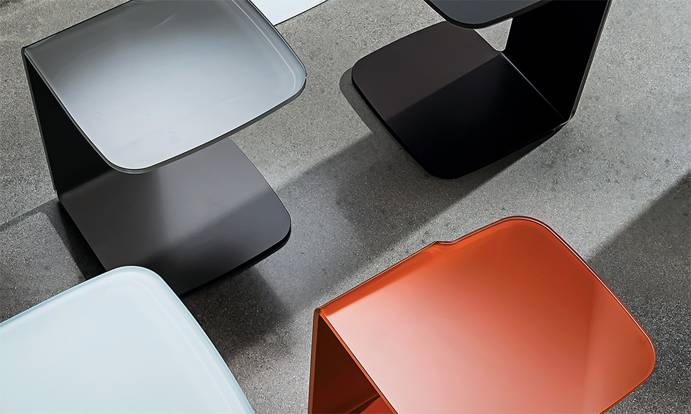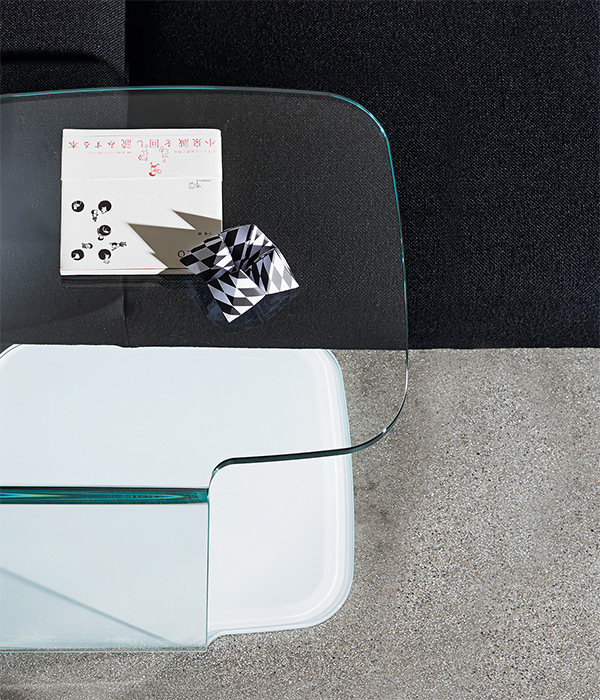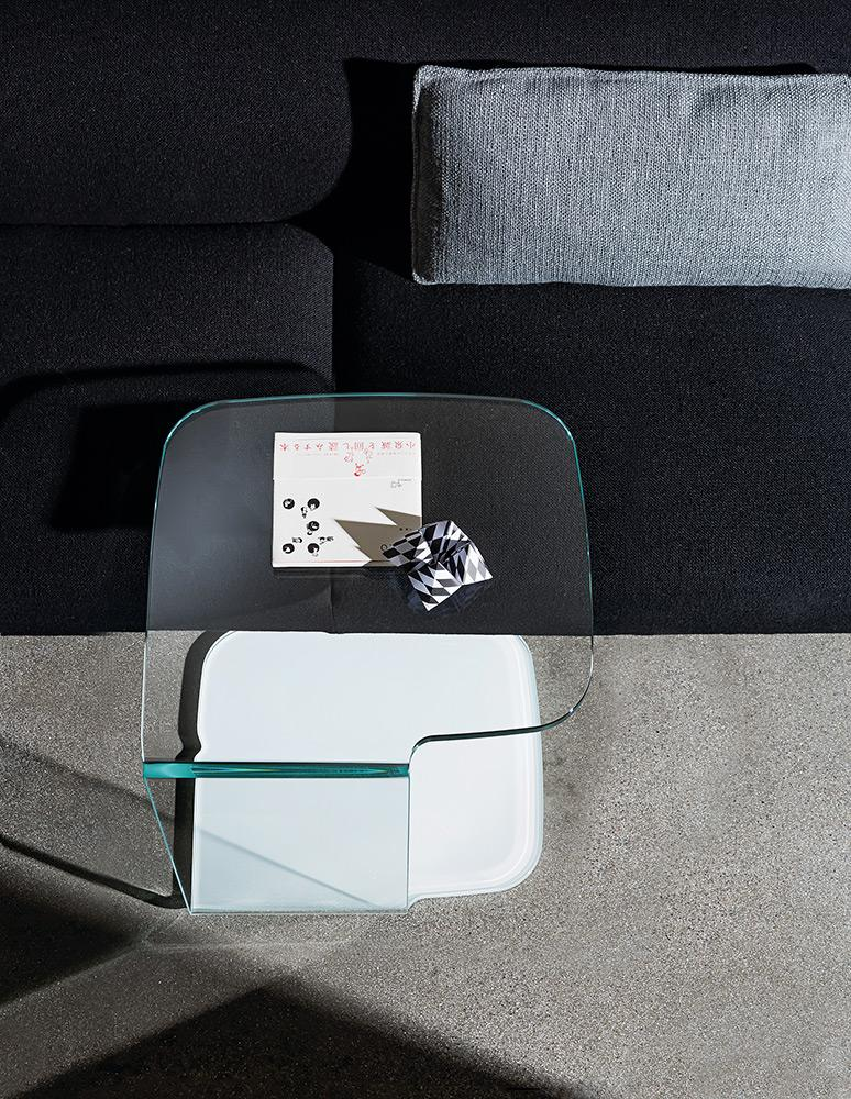 Tavolino in vetro curvo laccato mono o bicolore o in vetro trasparente extrachiaro con parte a terra laccata.2