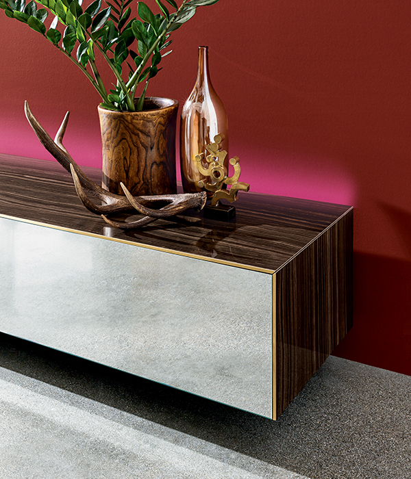 Sistema di madie sospese personalizzabili. Struttura e ante disponibili in specchio o ceramica, varie finiture, con o senza profilo in finitura ottone. Disponibile nelle versioni con o senza led. Telaio di sostegno in metallo; eventuali piedini di supporto inclusi.