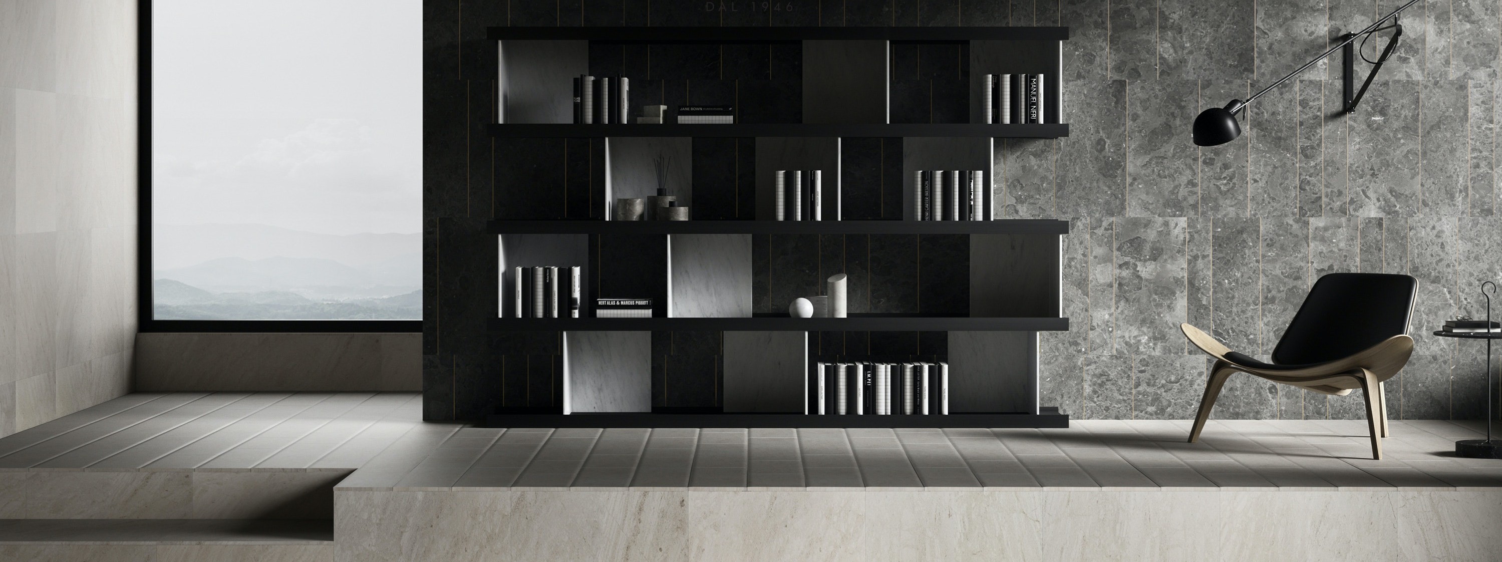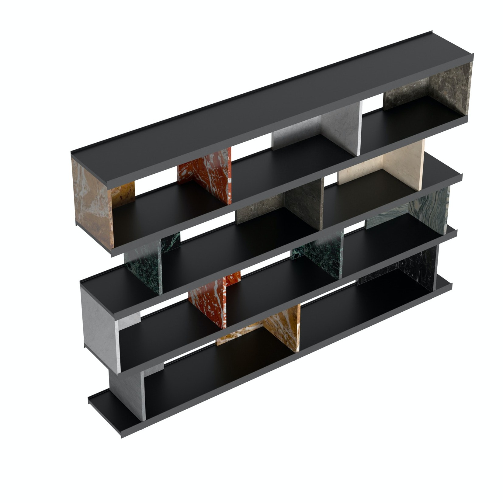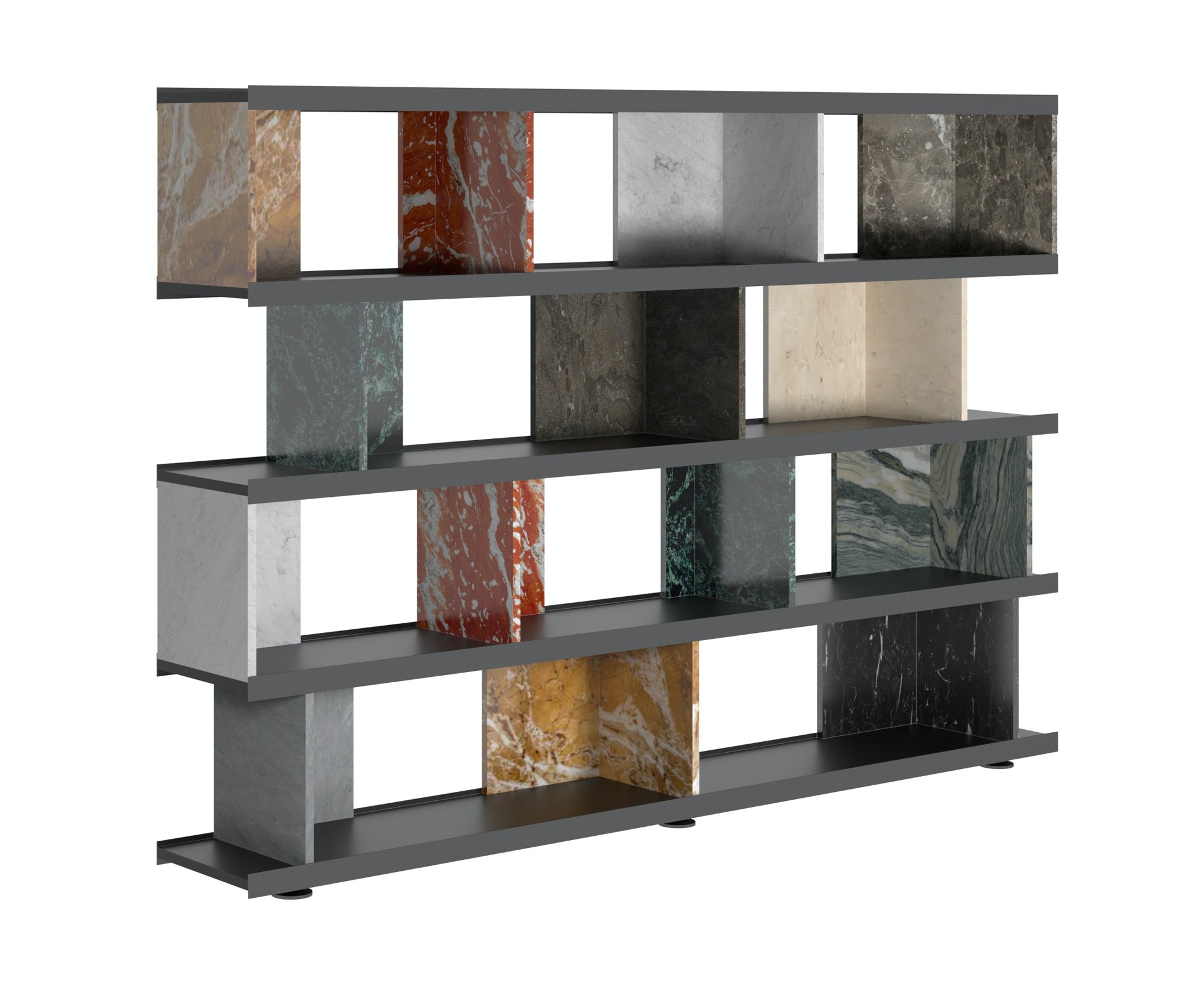 Piero Lissoni’s Colonnata bookcase is a striking combination of dark oak punctuated by dividers in natural stone ranging from classic white Carrara to regal greens and reds and glamorous black.