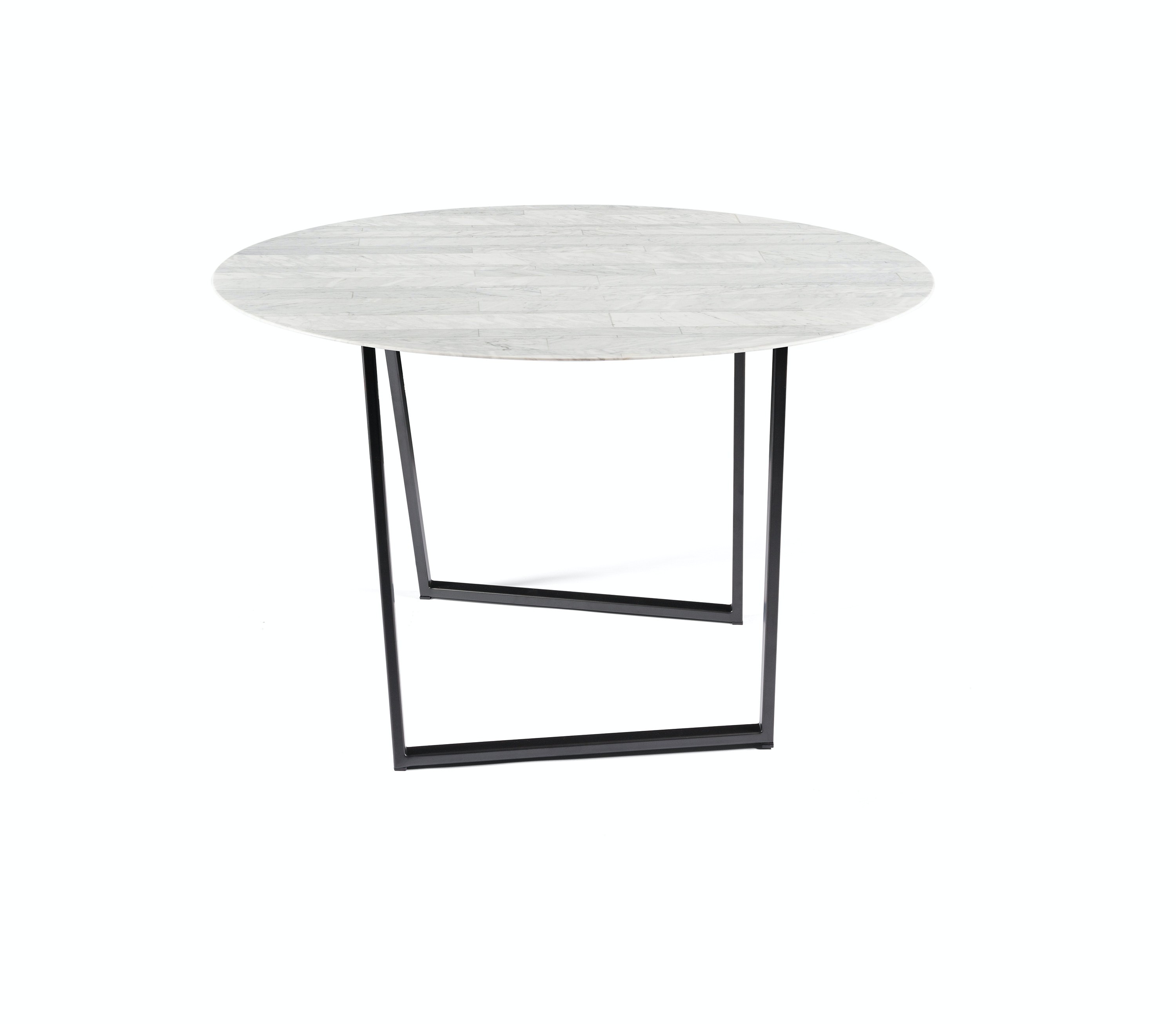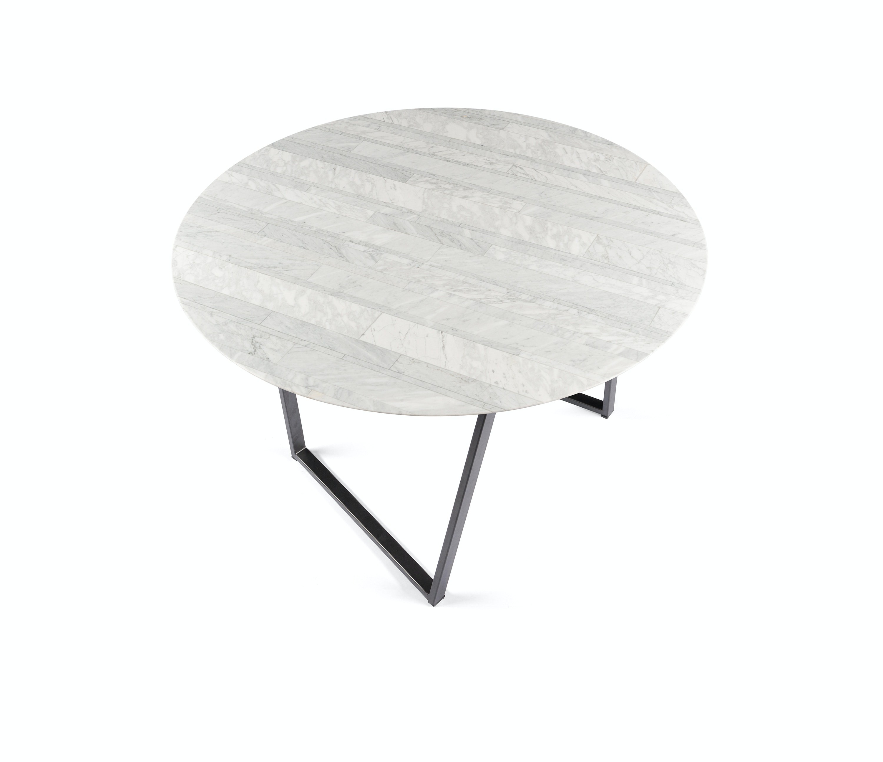 Designed in round, oval, rectangular and square versions, the tops were created to contrast with the sturdy iron frame, which is composed of slightly askew legs.