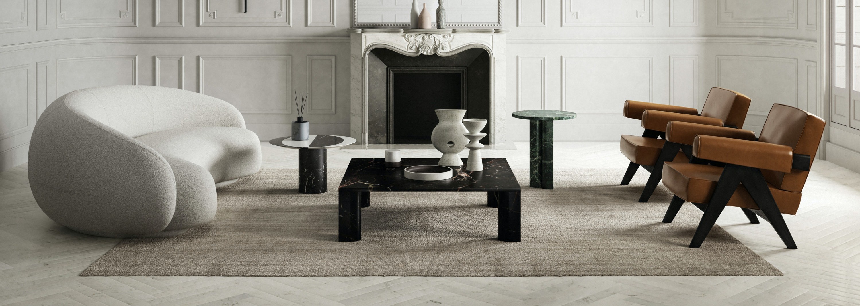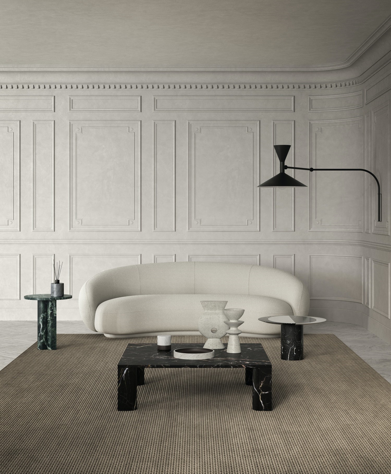Instead of the highly polished look often associated with marble, the designer chose a matte finish so as to bring a more contemporary touch to the stones, highlighting their specific qualities through this subdued process.