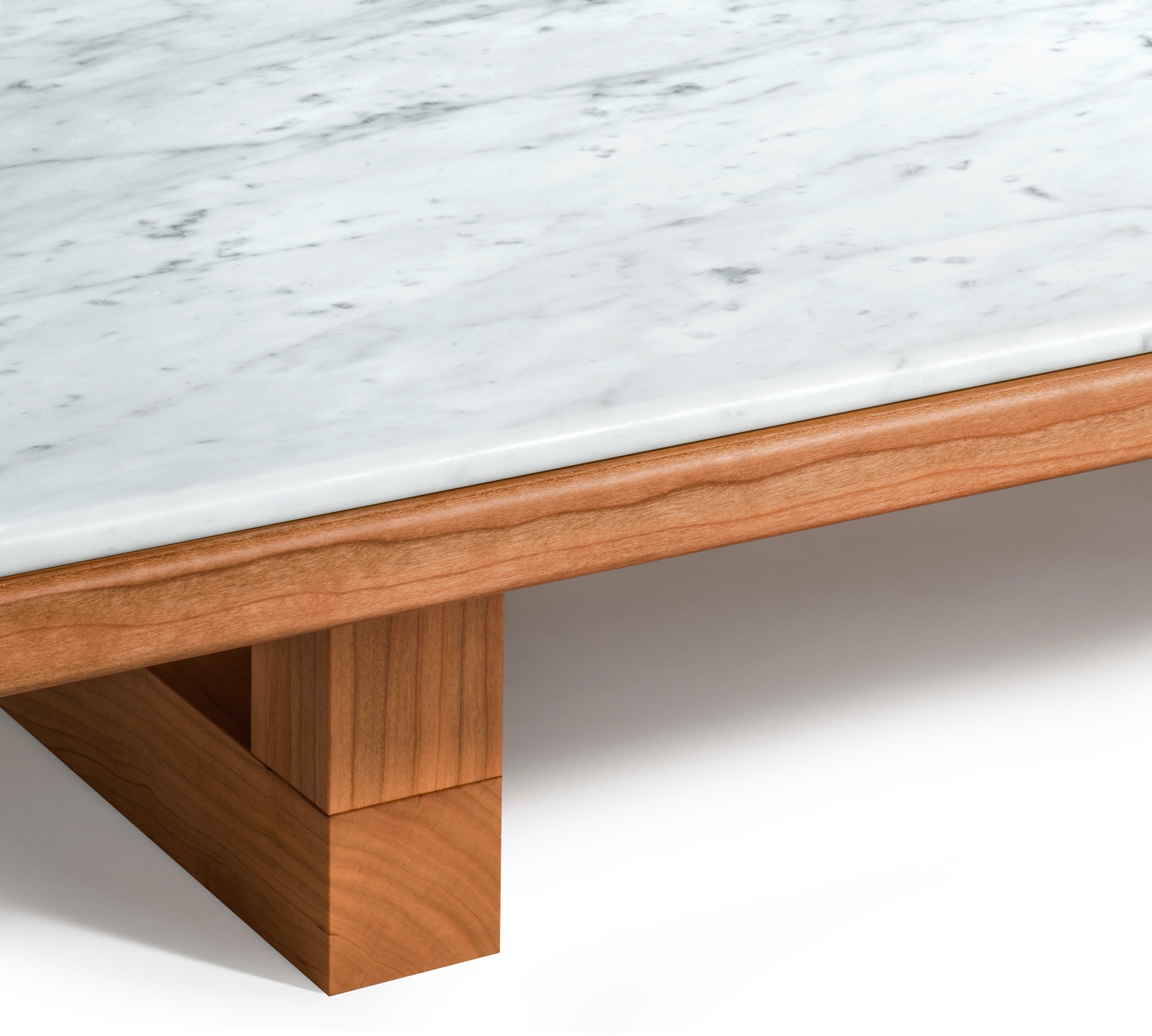 The coffee table pairs a square Bianco Carrara marble tabletop and a low-slung cherry wood structure and features careful details such as rounded edges and a simple but thoughtfully devised frame.