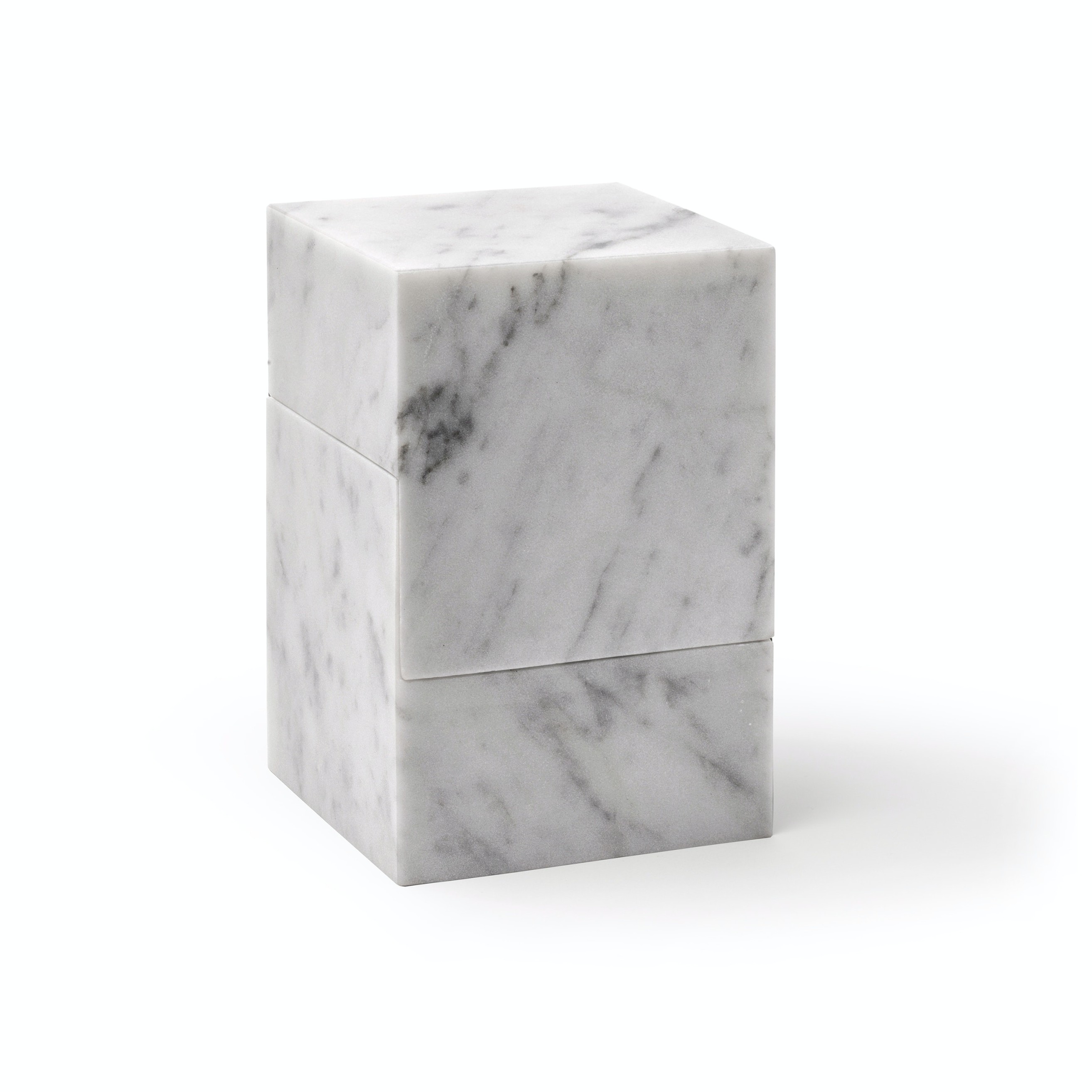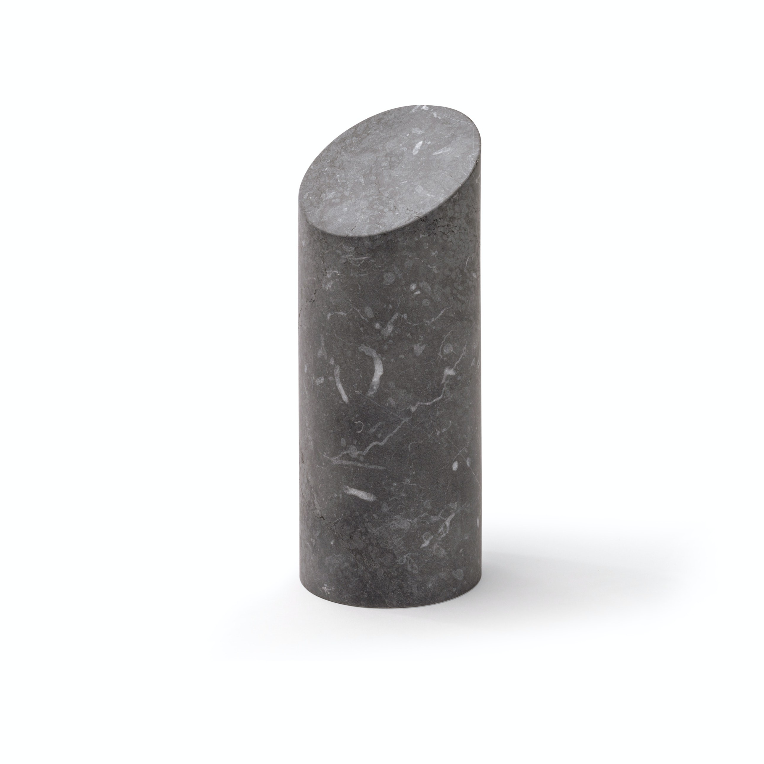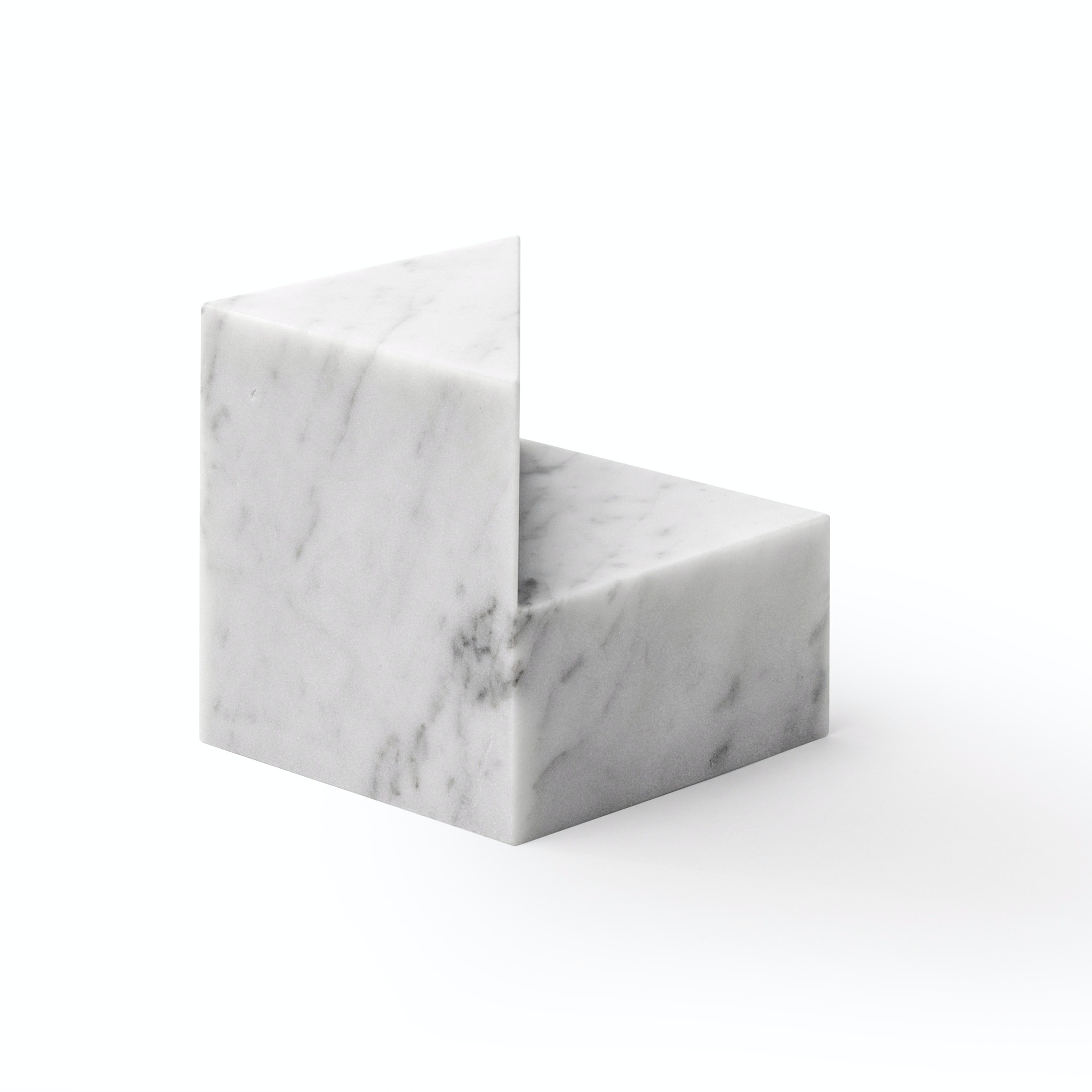 Available in a single sloped cylindrical tower or set of monolithic stepped blocks, the bookends are formed of either white Bianco Carrara marble from Tuscany or dusky black Nero Marquinia.