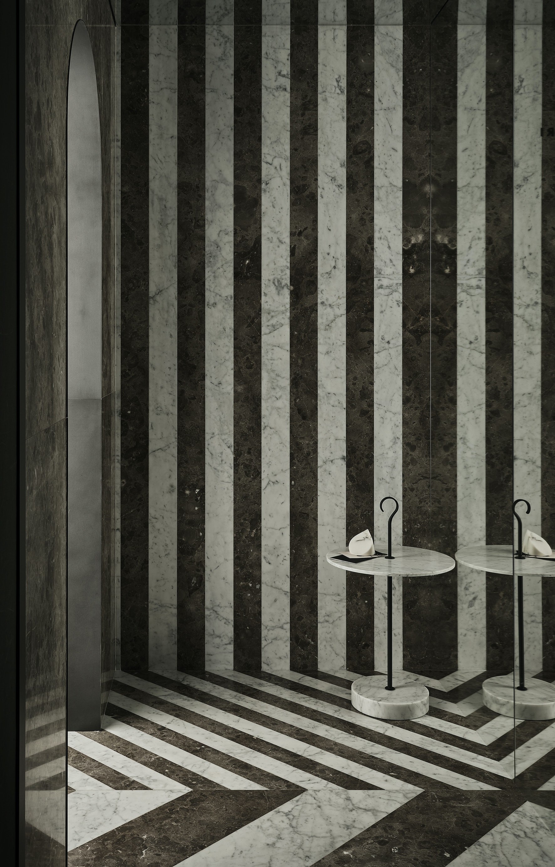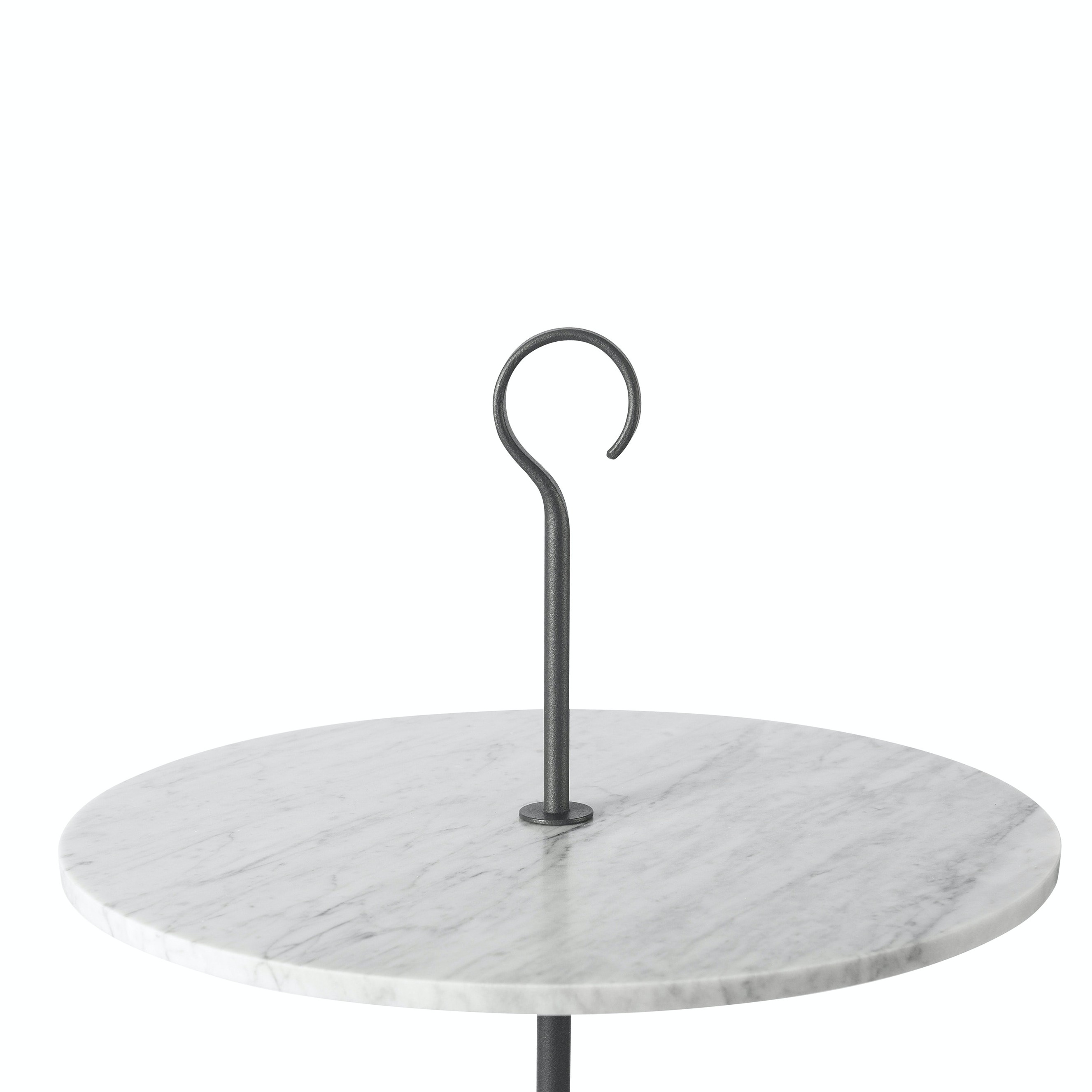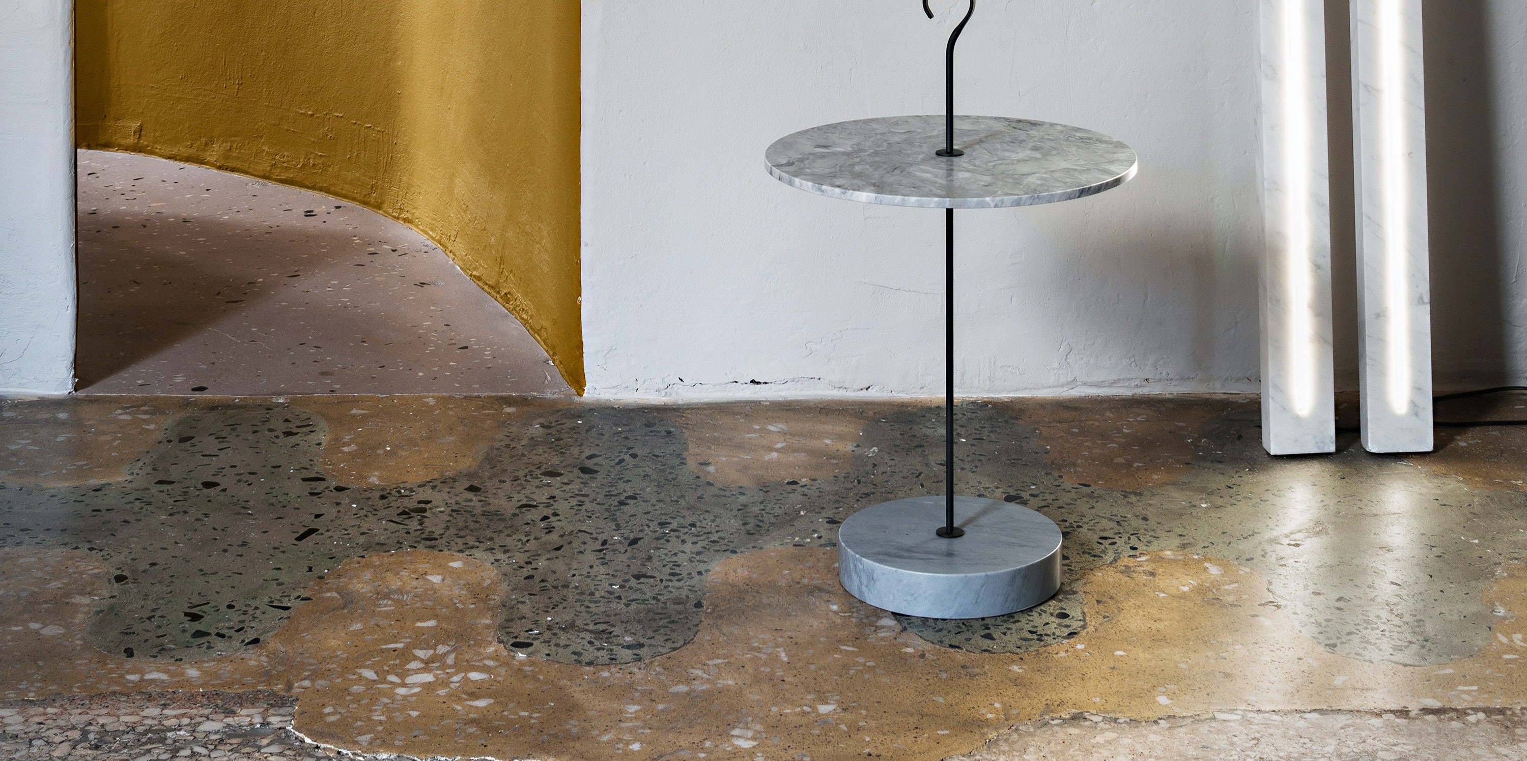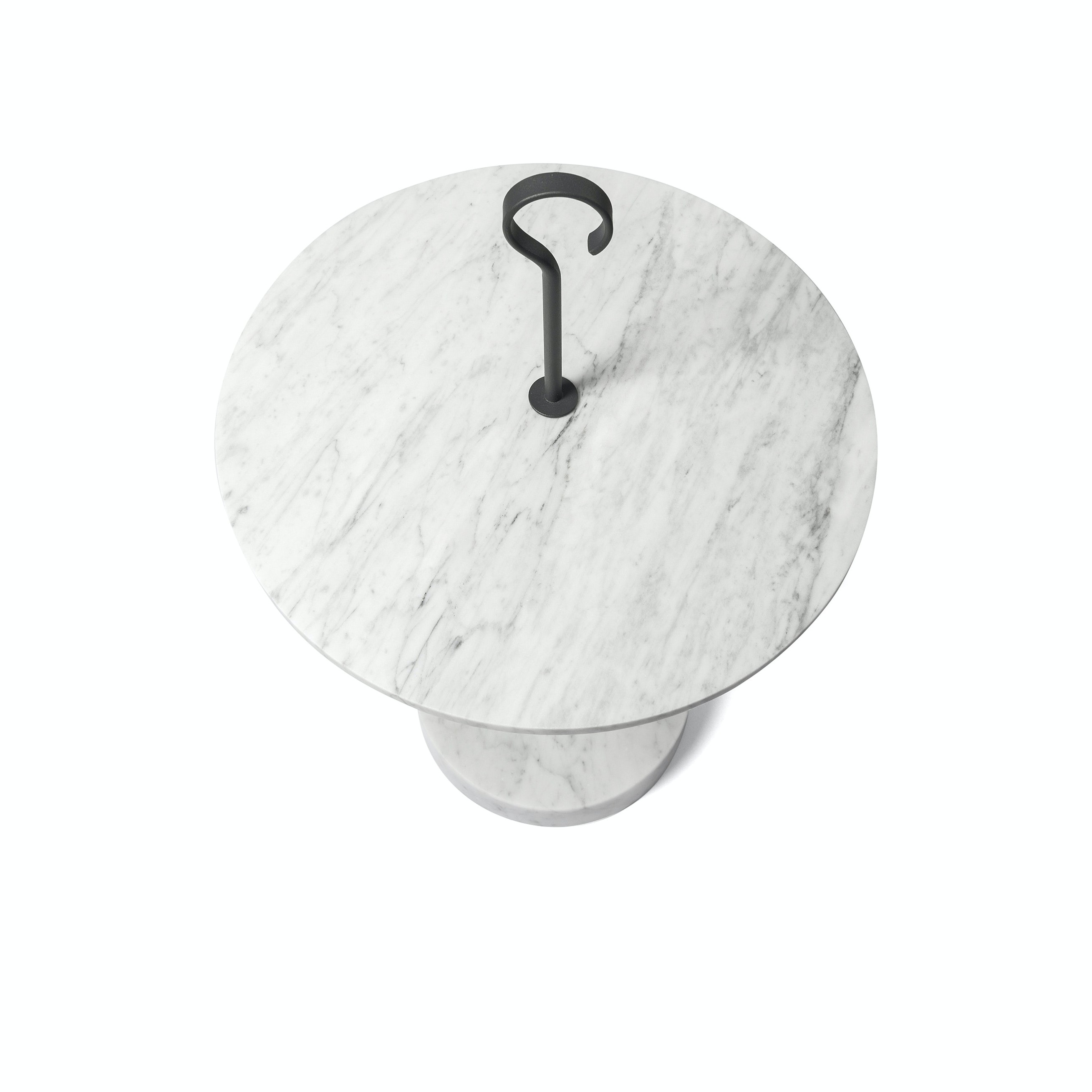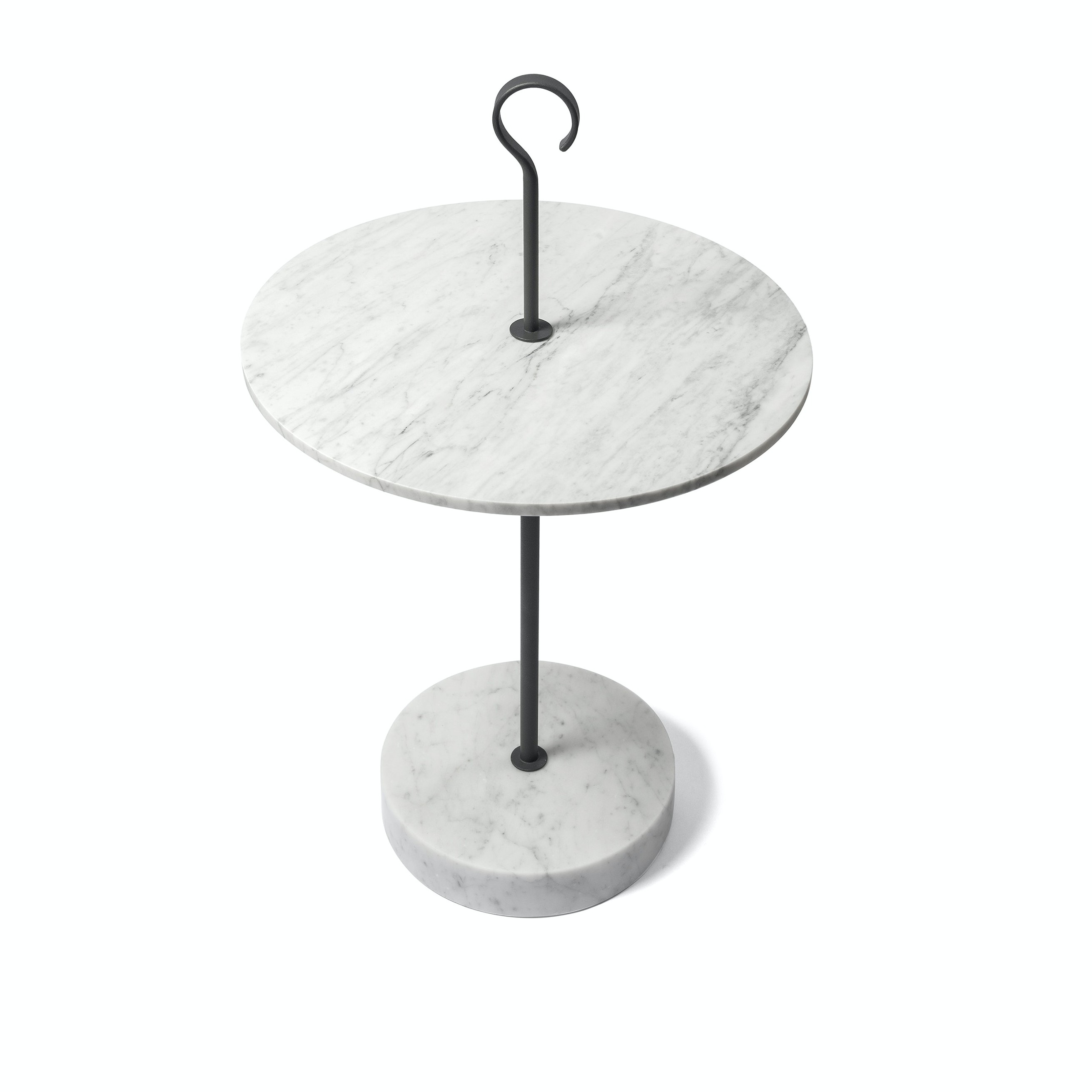 The L Collection 05 tables contrast striking marble with a steel stem to create robust attractive pieces. Composed of a hook-topped pillar, a circular marble table top and a sturdy base in the same type of stone, the L Collection 05 table series is an exceptional example of the decorative potential of natural stone.
