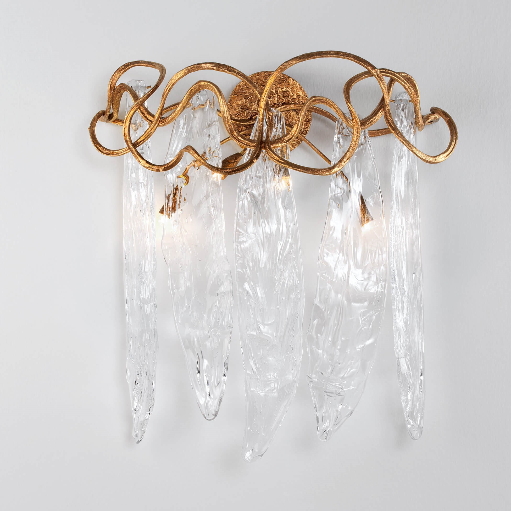 Visually embracing the tenacious and raw side of nature, this collection transpires a very close visual density of its inspirational waterfall through the glass pieces. The solid glass presence represents the untamed motion of water shaped, completed with organic patterns in a game of transparency and opacity, a characteristic that counteracts inertia and enhances movement. The metal structure follows the main concept with vines in a never ending fluid motion.