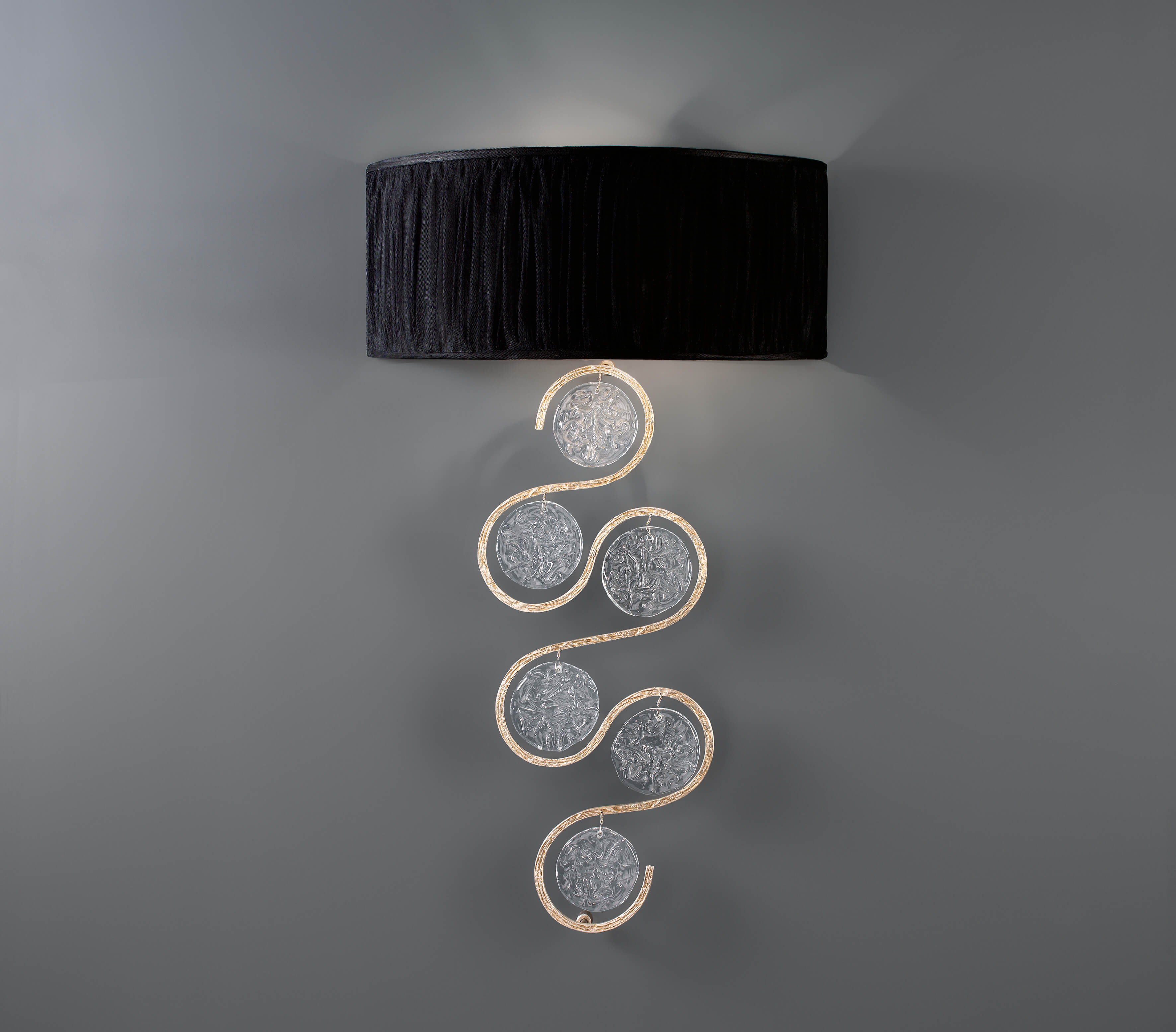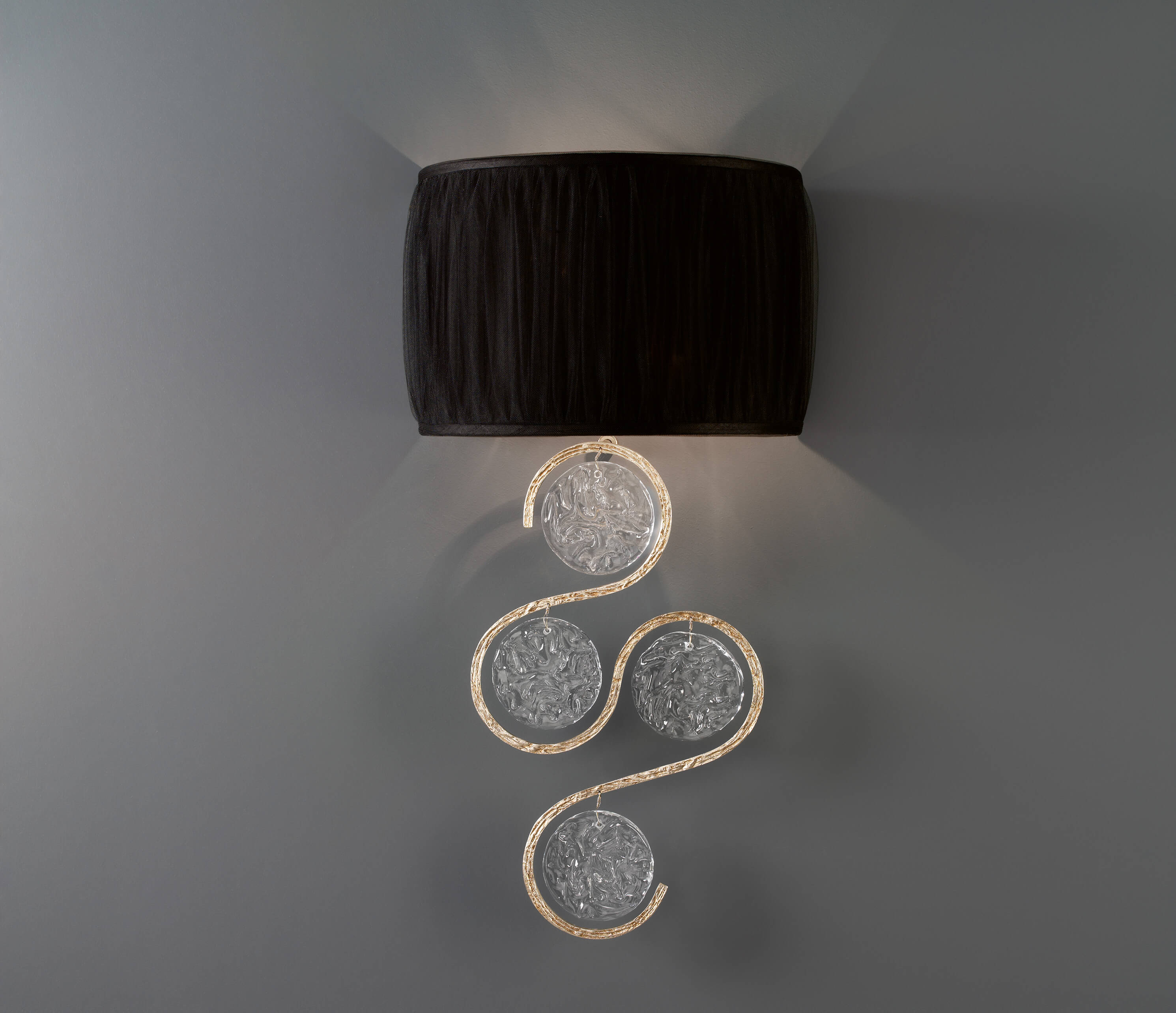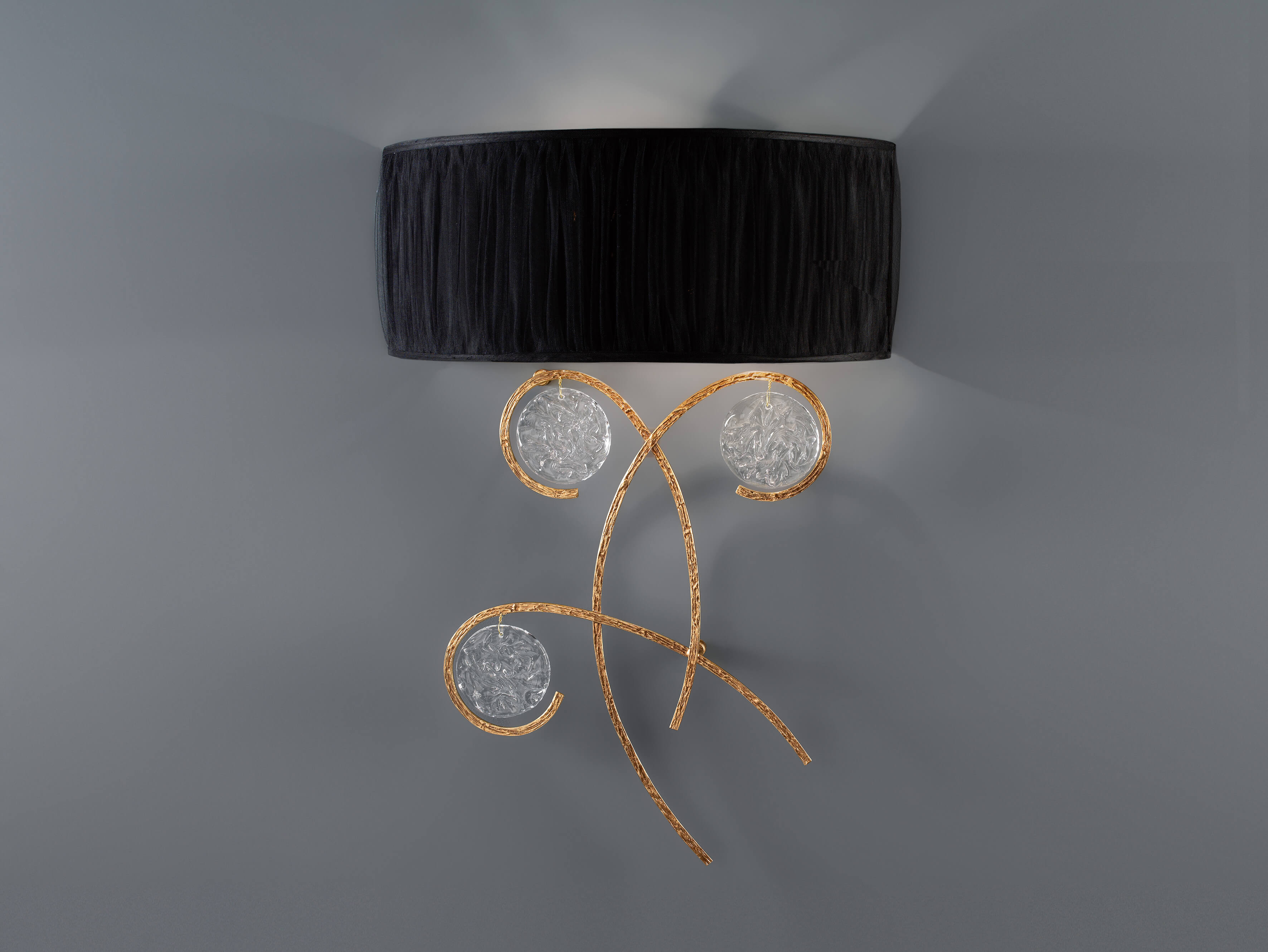 Delicate and with overflowing motion, this collection is inspired by musical notes and its conceptual graphic visualization. The inspiring twist and turn of the structure bronze lines represent melodies, music and symphonies, complete with the trembling pattern of the glass which represents the vibration of sound by itself.