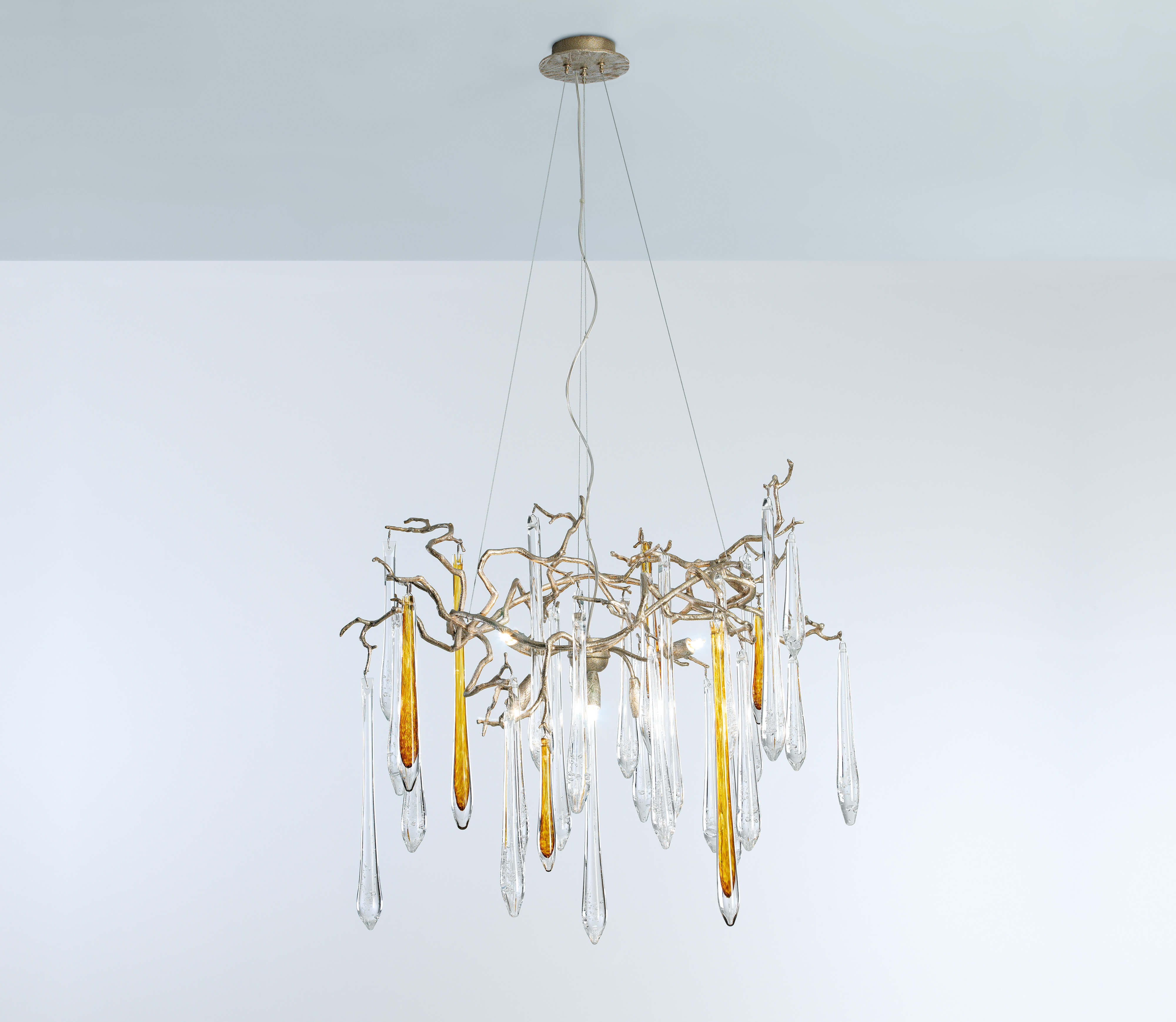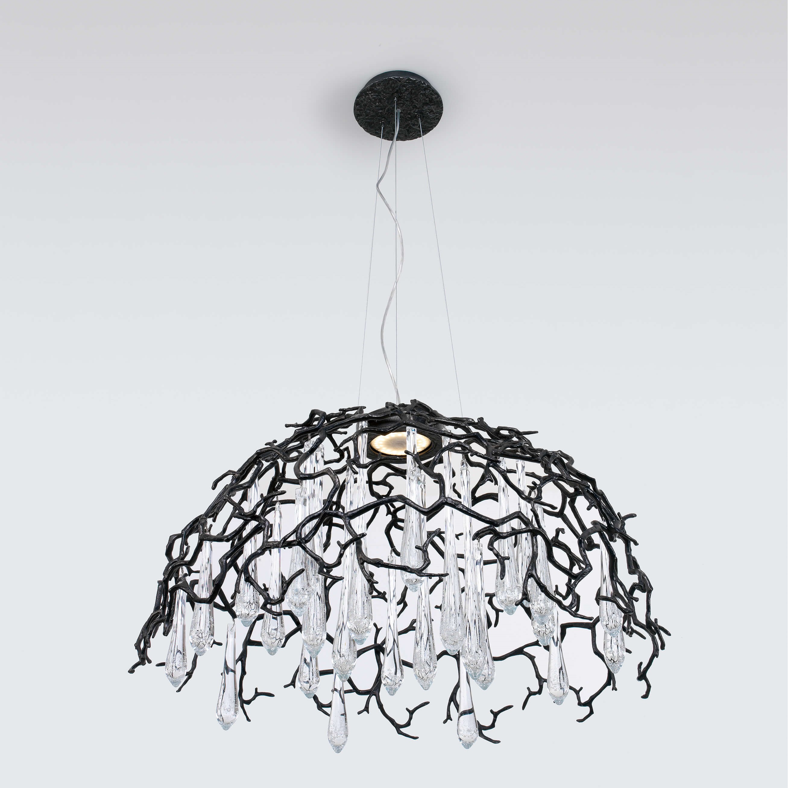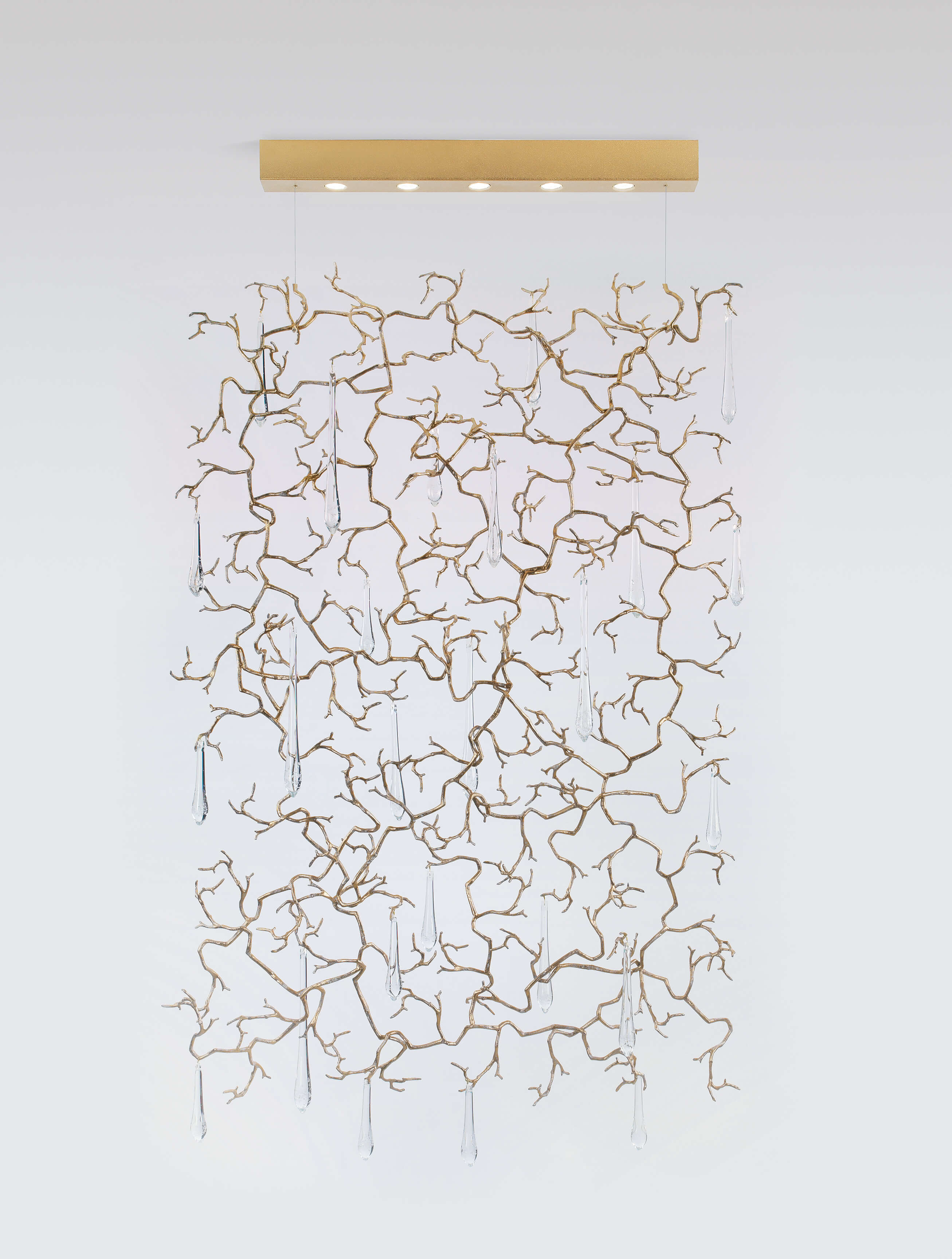 The Aqua Collection is an iconic set of the Serip family, both by its element of inspiration and by its inherent association with our identity, expressing a strong connection to our main inspiration source, nature. The bronze structure expands in entangled branches that lead to floating glass pieces, a characteristic that concedes an airy touch together with its delicate and elegant look, concepts visible in the smallest detail of the glass drops. Through several chromatic choices and design options, the Aqua Collection presents itself as an exquisite nature-inspired piece, perfect for any concept.