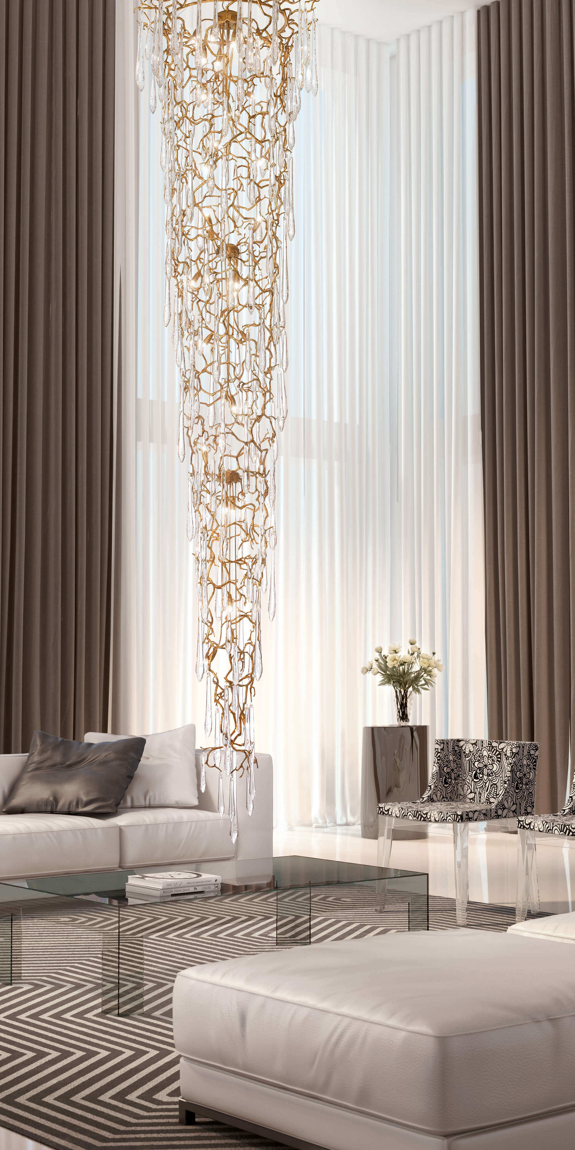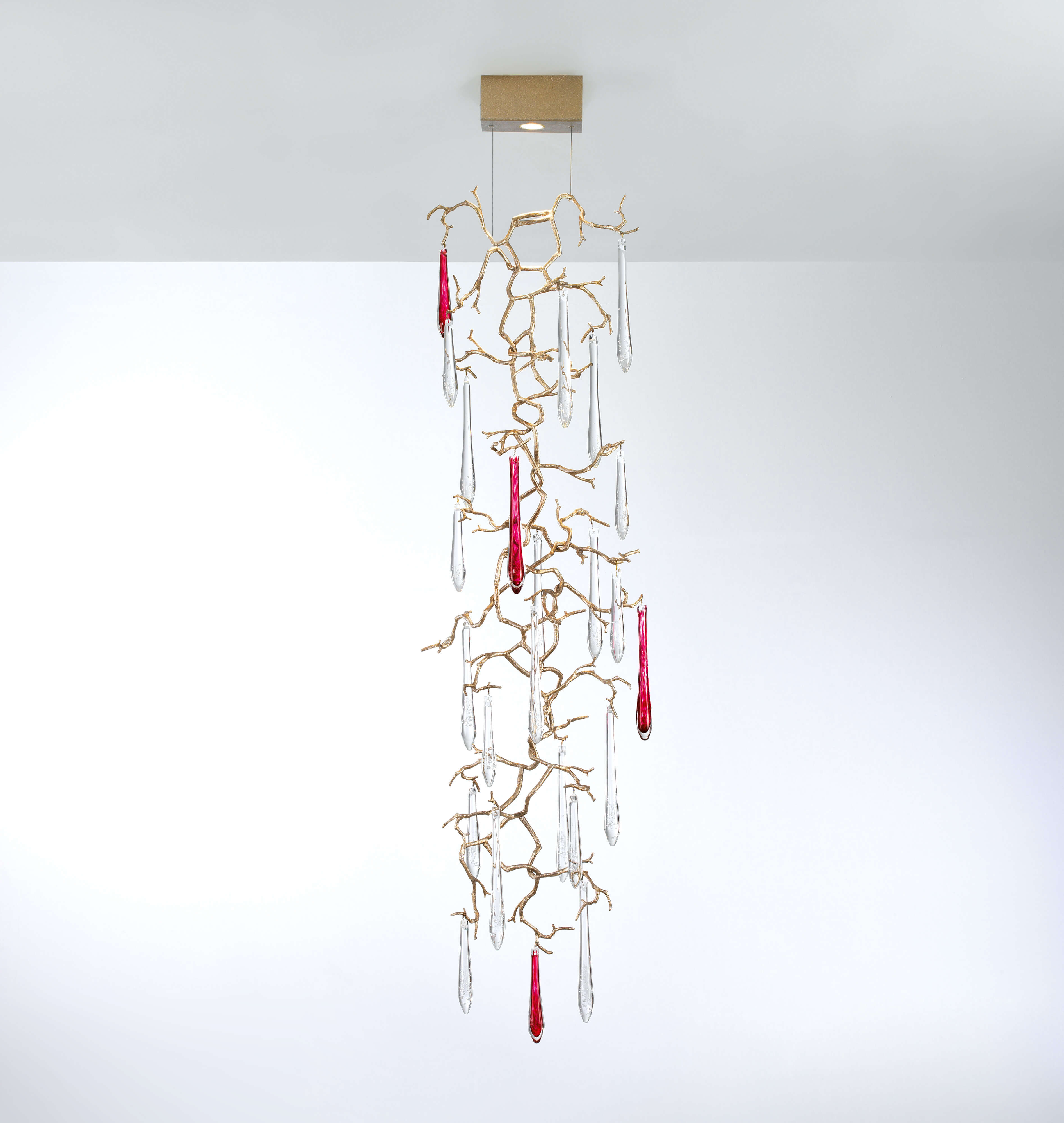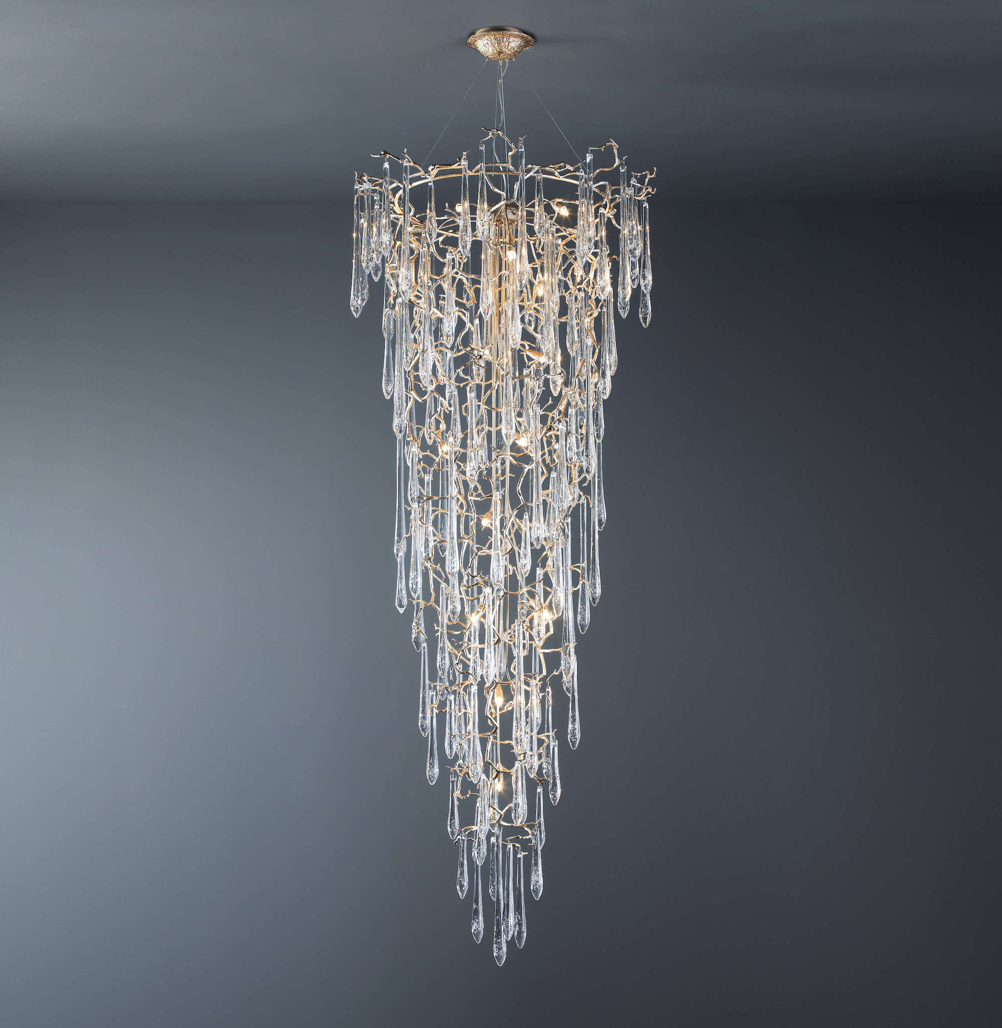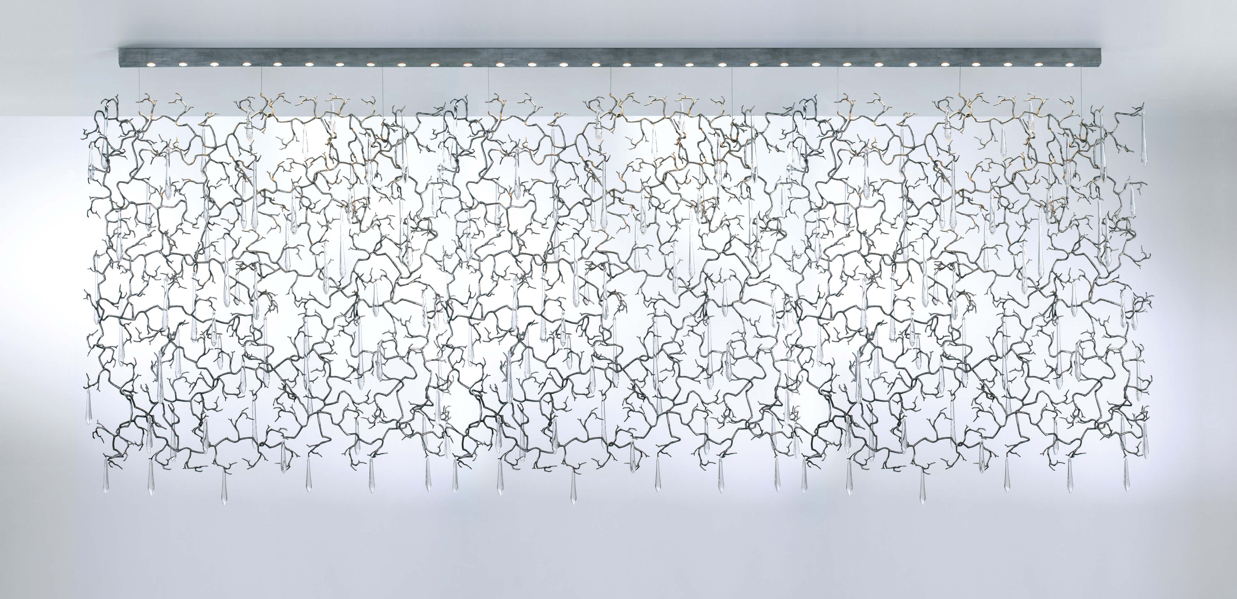 The Aqua Collection is an iconic set of the Serip family, both by its element of inspiration and by its inherent association with our identity, expressing a strong connection to our main inspiration source, nature. The bronze structure expands in entangled branches that lead to floating glass pieces, a characteristic that concedes an airy touch together with its delicate and elegant look, concepts visible in the smallest detail of the glass drops. Through several chromatic choices and design options, the Aqua Collection presents itself as an exquisite nature-inspired piece, perfect for any concept.