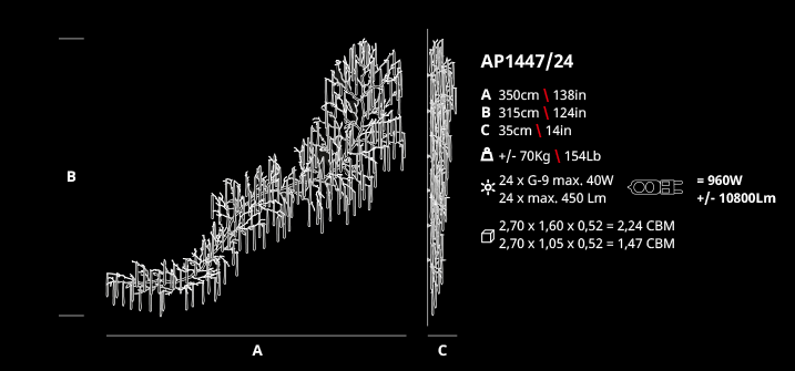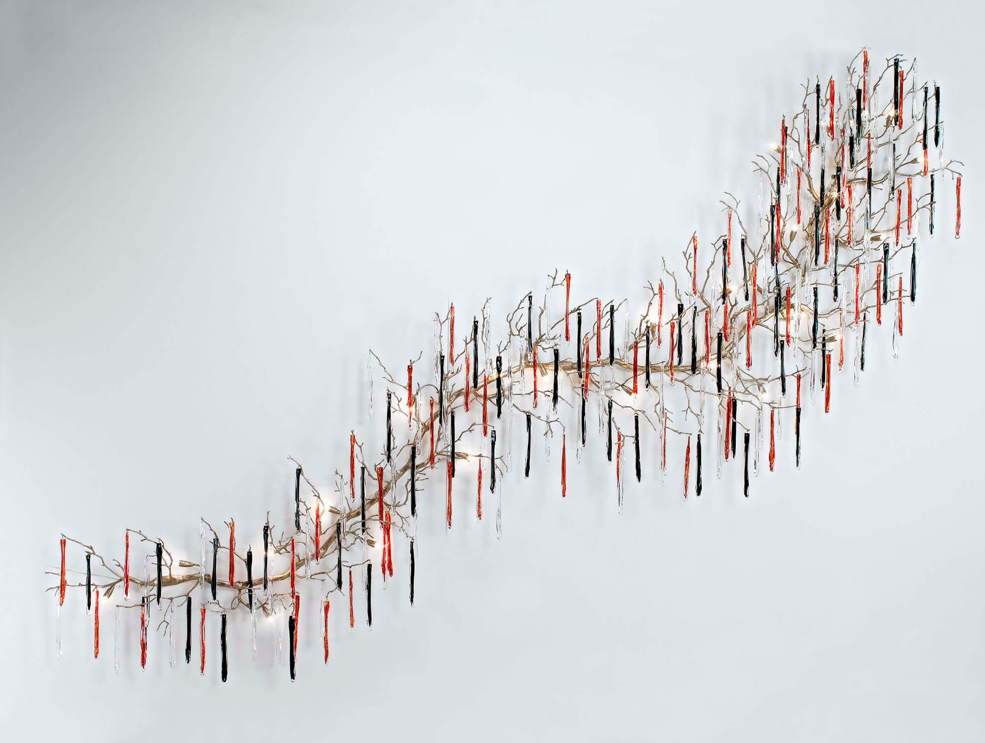 Following a vertical and horizontal visual guide, the Glamour Collection represents winter's nature where trees turn into ice sculptures. These lighting installations with inherent organic presence spread downwards and along ceilings and walls, being able to be an effectively adaptable piece in any interior. Regardless of the model design, the collection exposes an interesting dualism of weights and materials, in a varied range of chromatic and finishing options to be chosen for each project. The possibility to create any kind of colour combination opens the way to a versatile outcome, establishing a limitless key-piece.