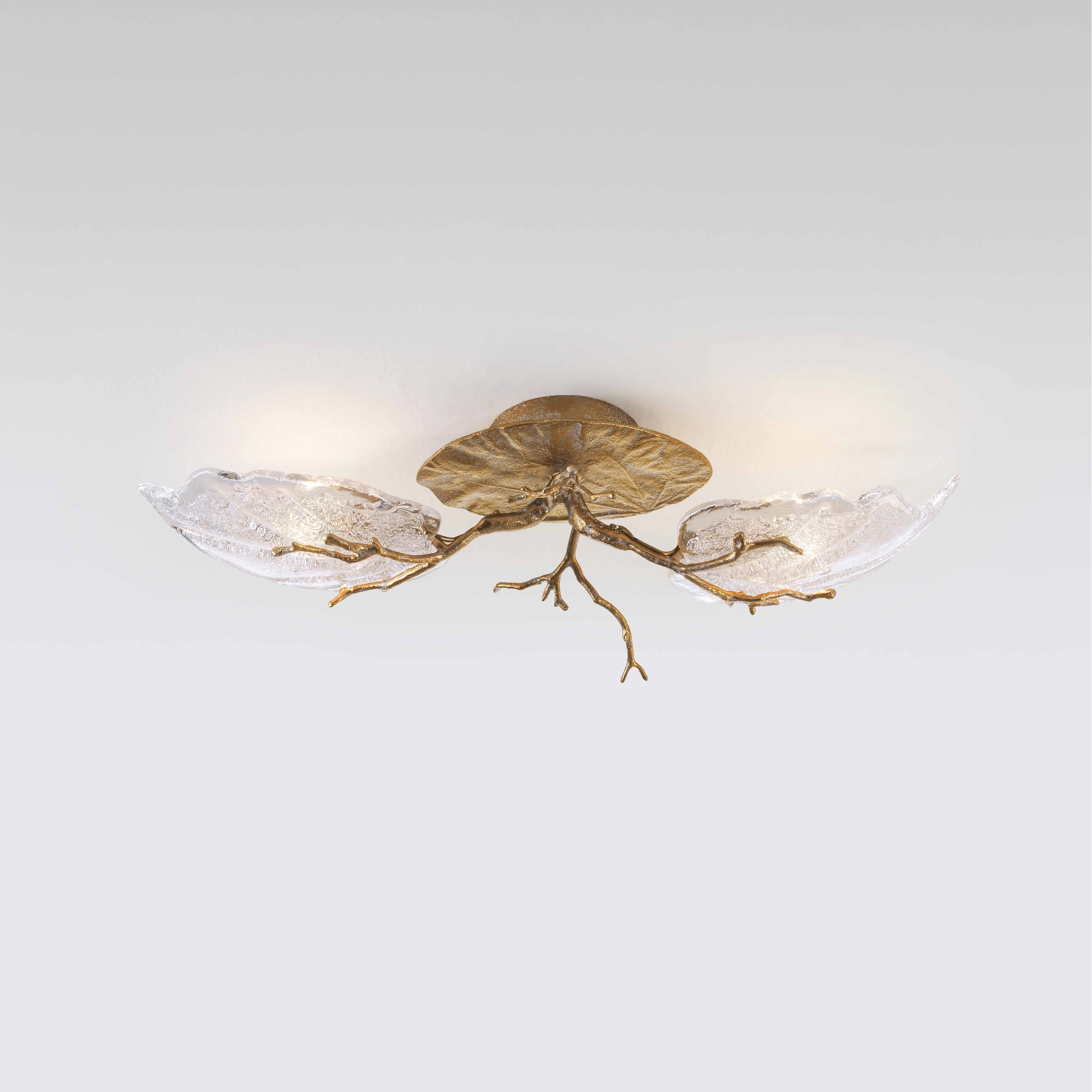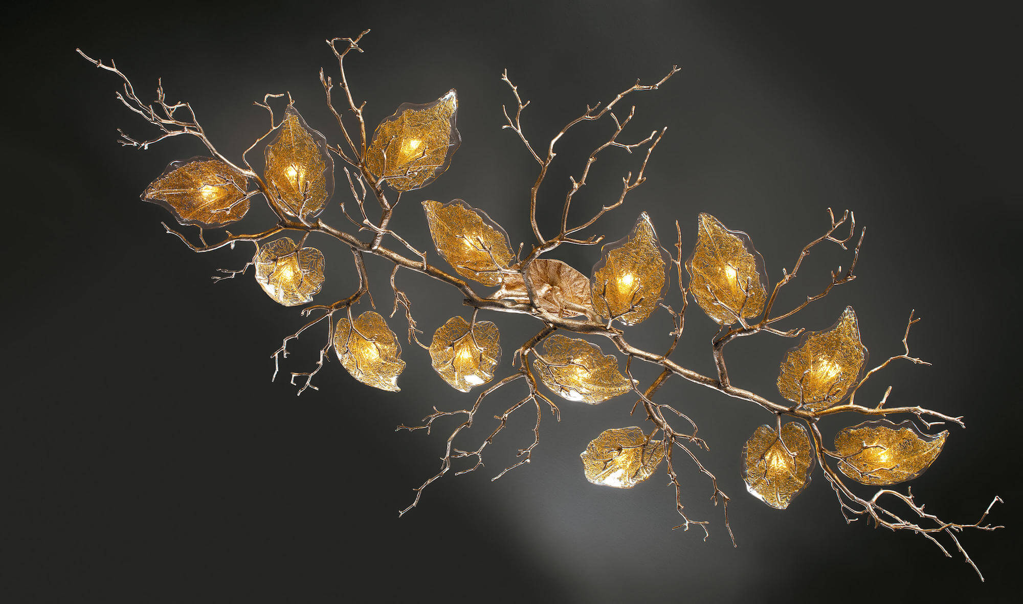 Designed with a random disposition of glass leaves that look like floating lights embraced by branches.