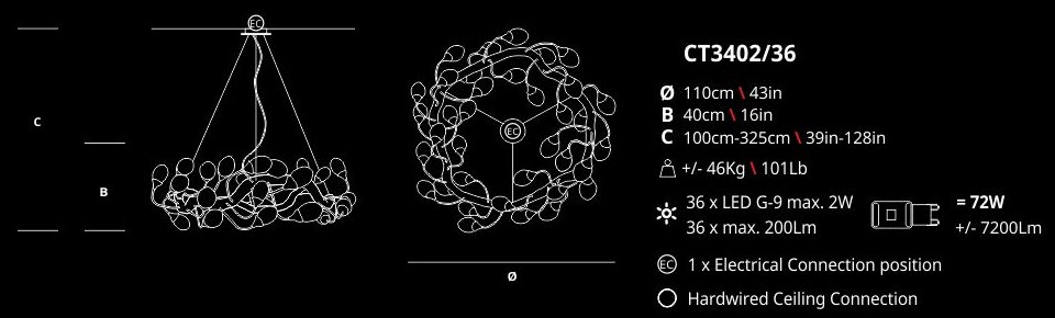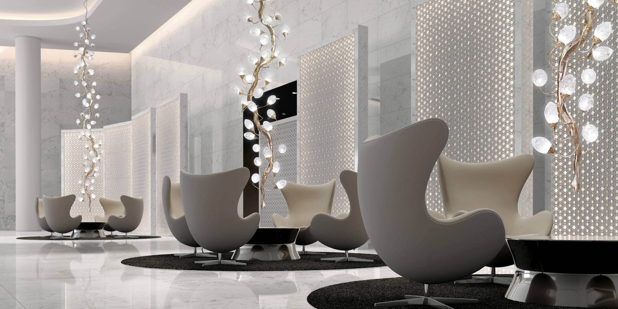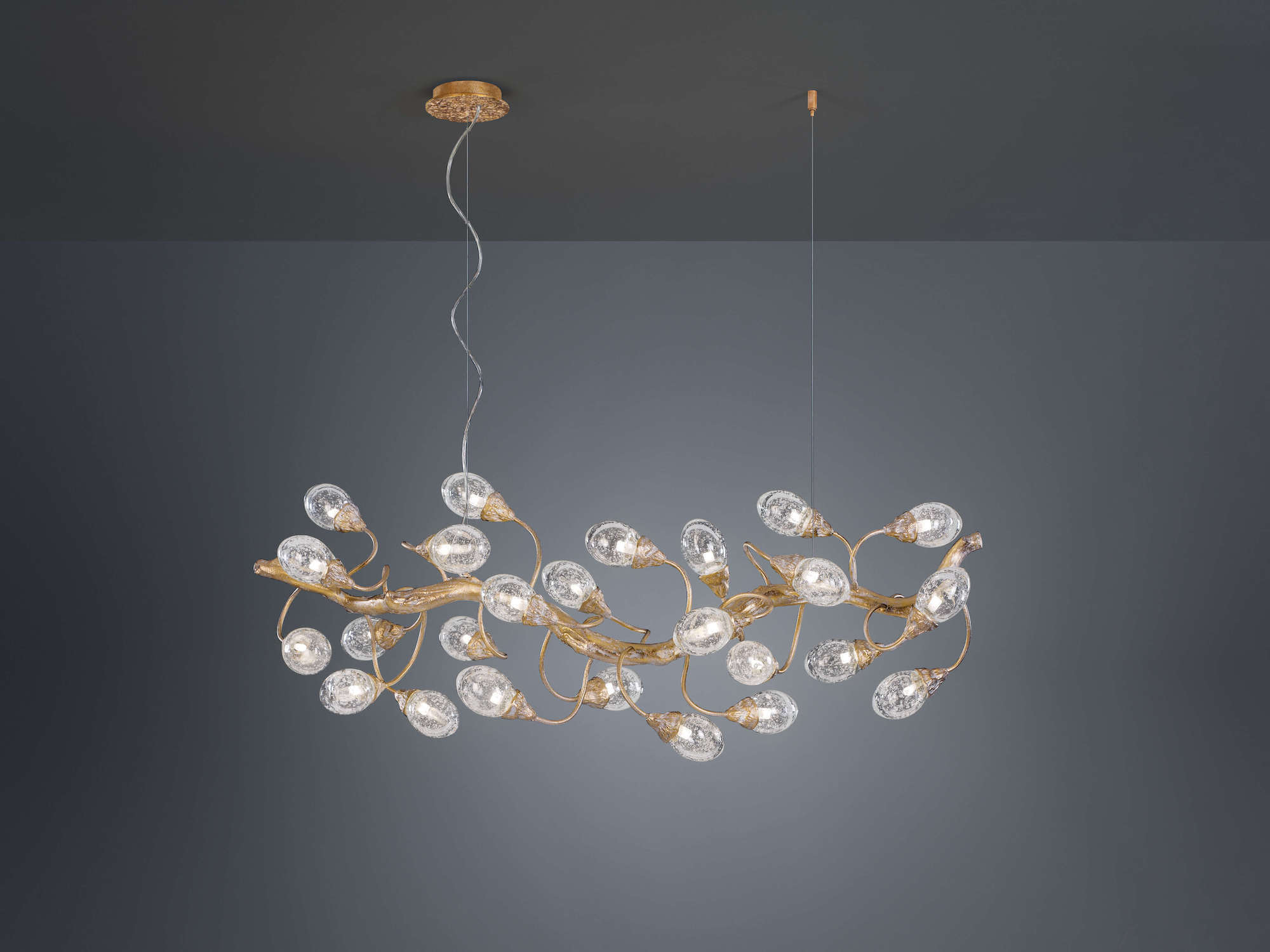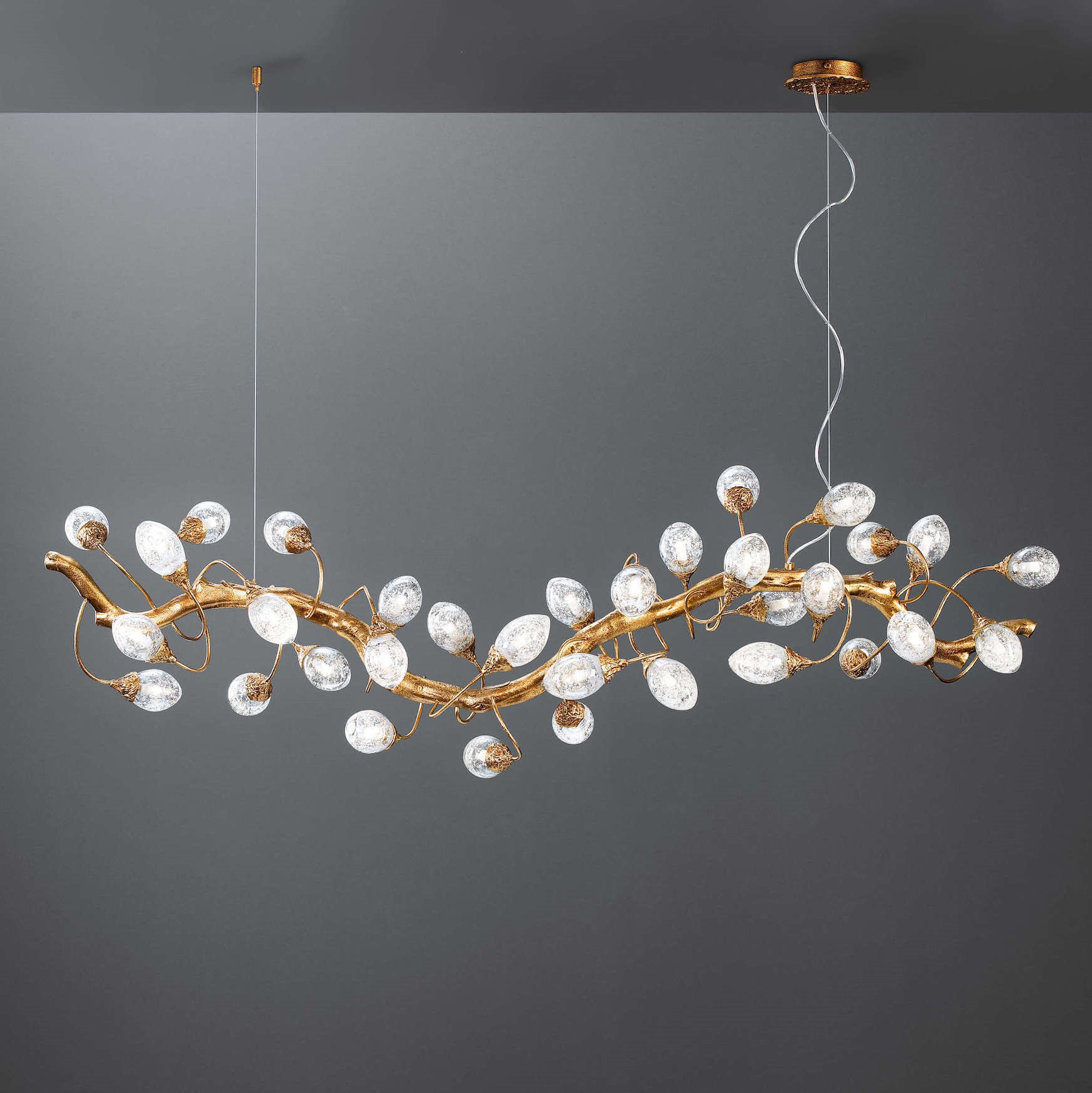 Lotus design follows the inherent evolutionary disposition of an organism, proposing a spiral arrangement almost like a living sculpture of motion and growing light sources. The egg-shaped glass pieces emit light to involve the entire piece as a single organic silhouette, a Serip trademark throughout all lighting designs, revealing an interesting glass work that includes bubbles in each piece - factor that confers unique characteristics to the light emission.