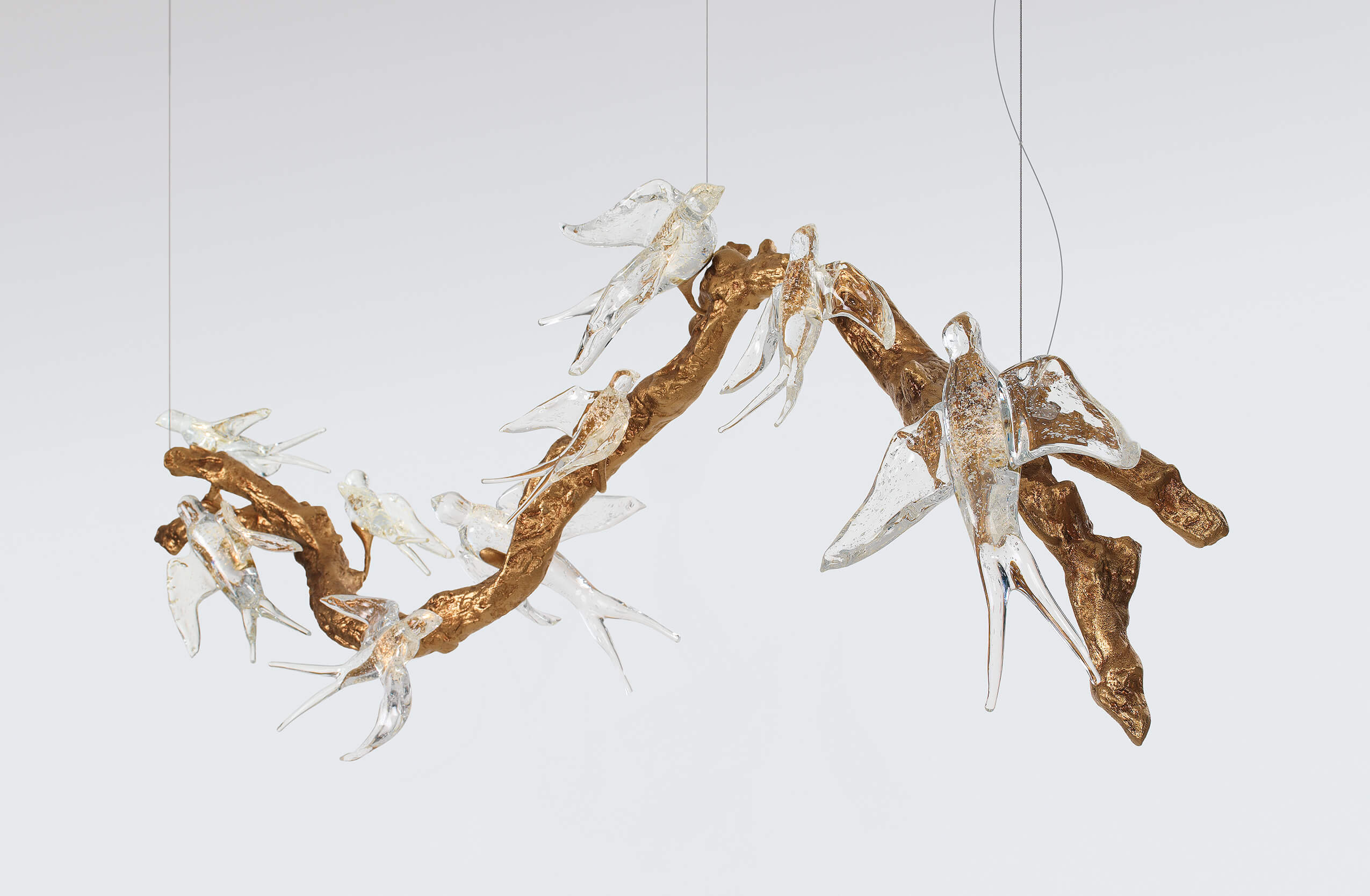 This marvellous species of swallows known as “Hirundo Rustica” presents spectacular ballets where they paint the skies like ballerinas. Their funnel-shaped bodies are also a Portuguese icon, which translates our soul in movements and shapes. The unfindable configurations that they perform allow this singular collection to create beautiful visual compositions. Either in suspension or standing on the walls, they create a dramatic game of shadows and light. Also, they can stay aligned, side by side, in an extreme organic and sharp textured tree branch creating extraordinary contrasts with the smooth and fluid shapes of their bodies.