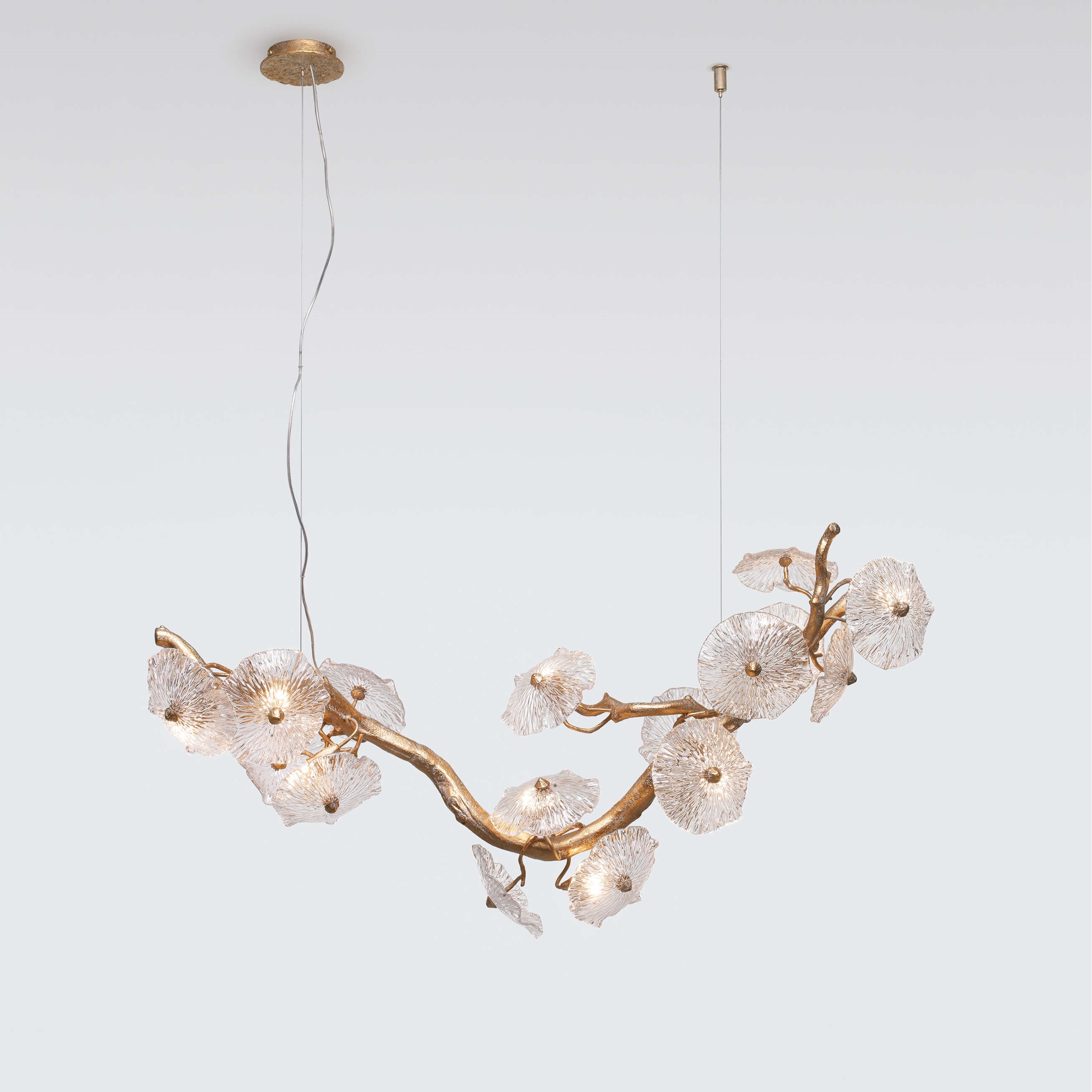 Beyond its particular dense structure and closed shape in some designs, it seeks an uncanny levitating sense, allowing multiple perspectives through the carefully crafted Murano glass pieces. Through the glass specifications, the Nenufar achieves diffuse lighting providing an alluring romantic sense, reminiscent of the natural beauty of nature.