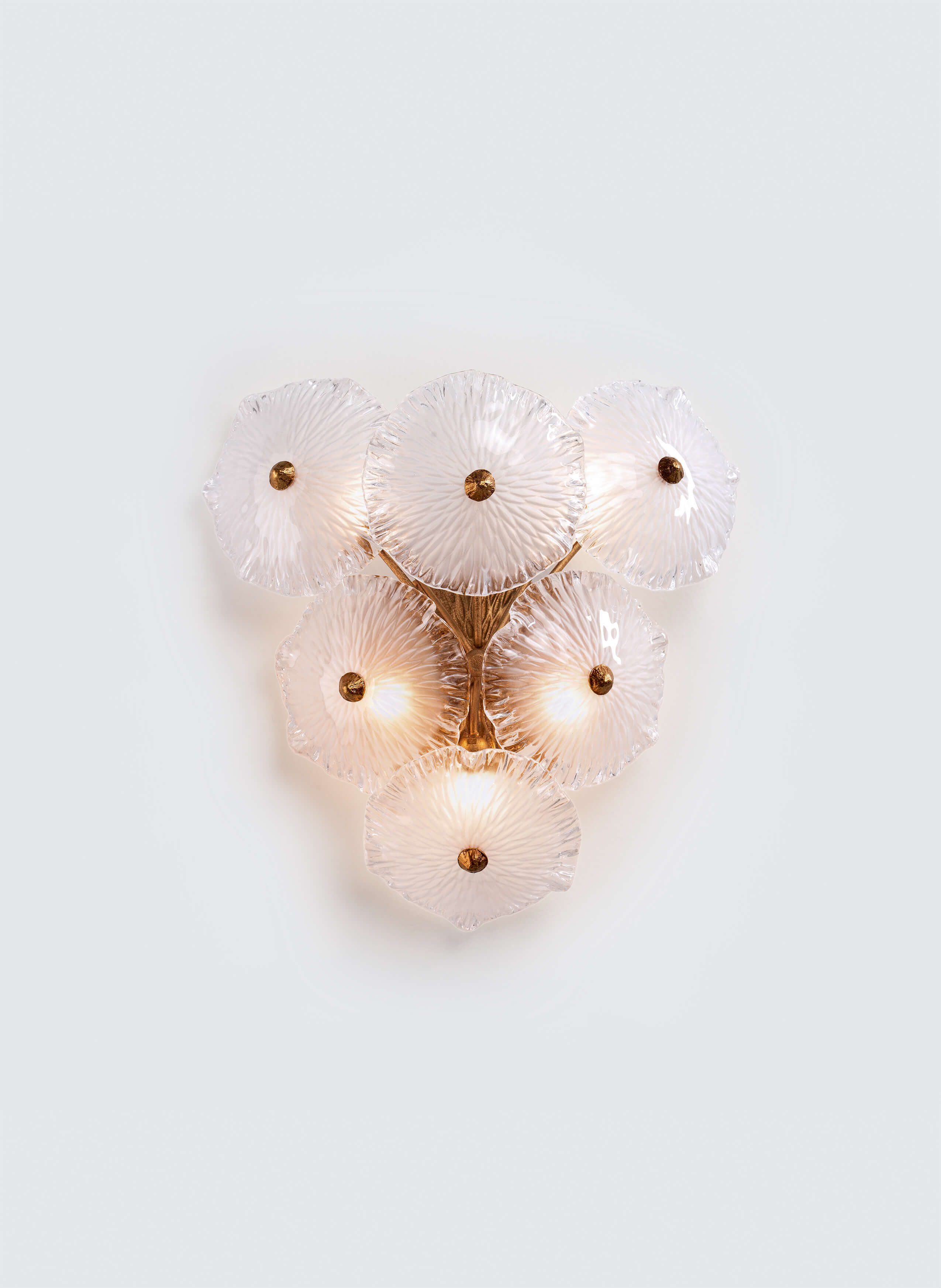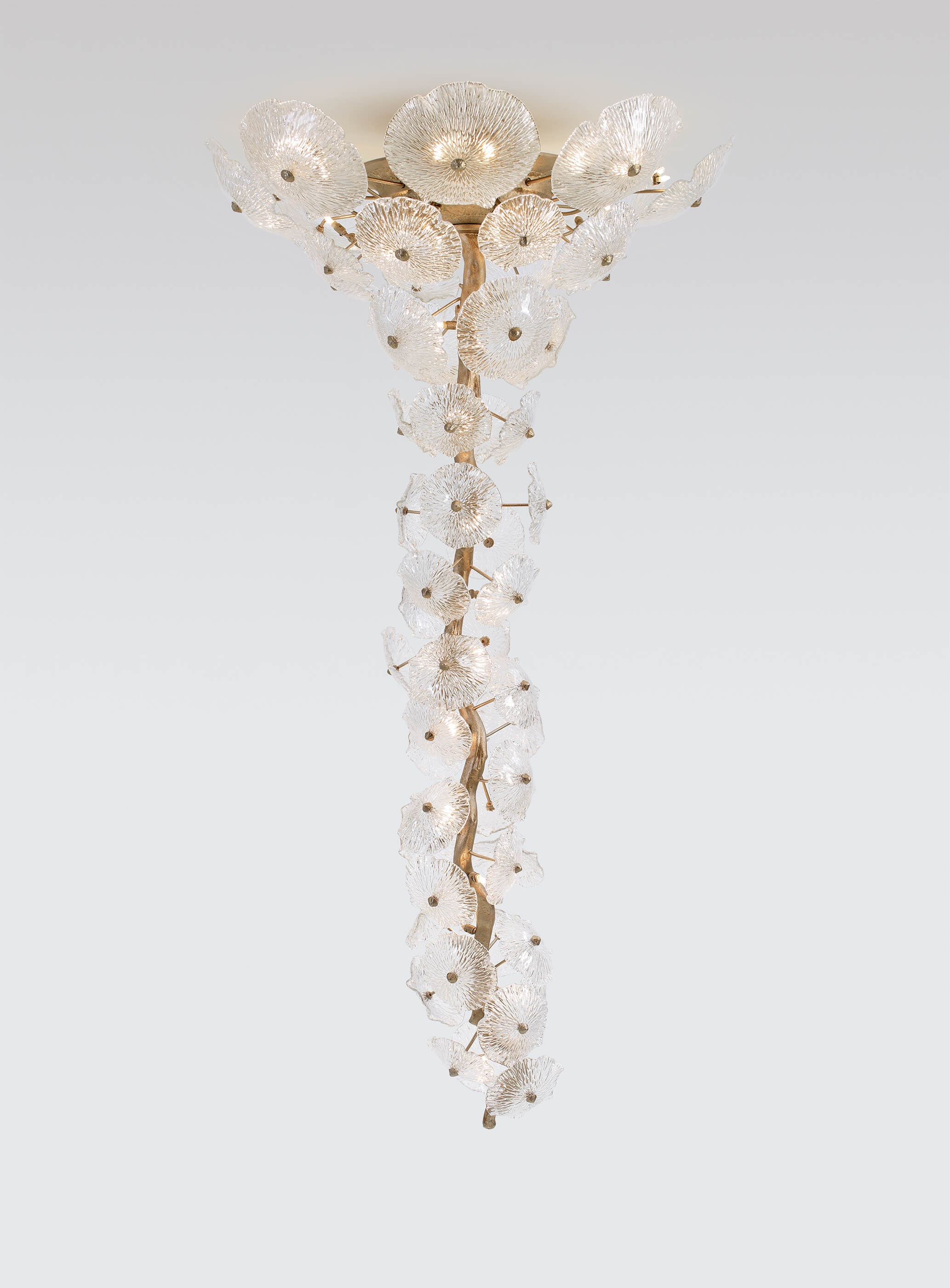 Beyond its particular dense structure and closed shape in some designs, it seeks an uncanny levitating sense, allowing multiple perspectives through the carefully crafted Murano glass pieces. Through the glass specifications, the Nenufar achieves diffuse lighting providing an alluring romantic sense, reminiscent of the natural beauty of nature.