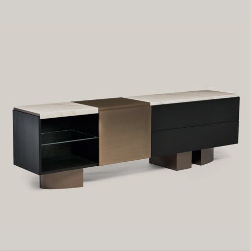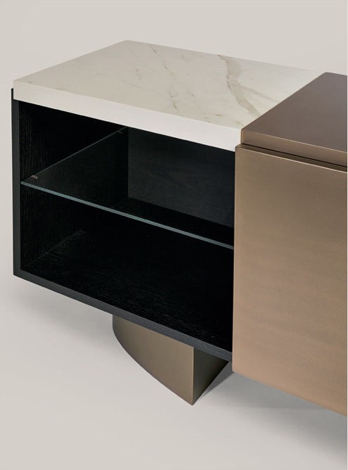 T150 noir with light bronze elements, top in polished porcelain Calacatta Oro, extra clear inner shelves
