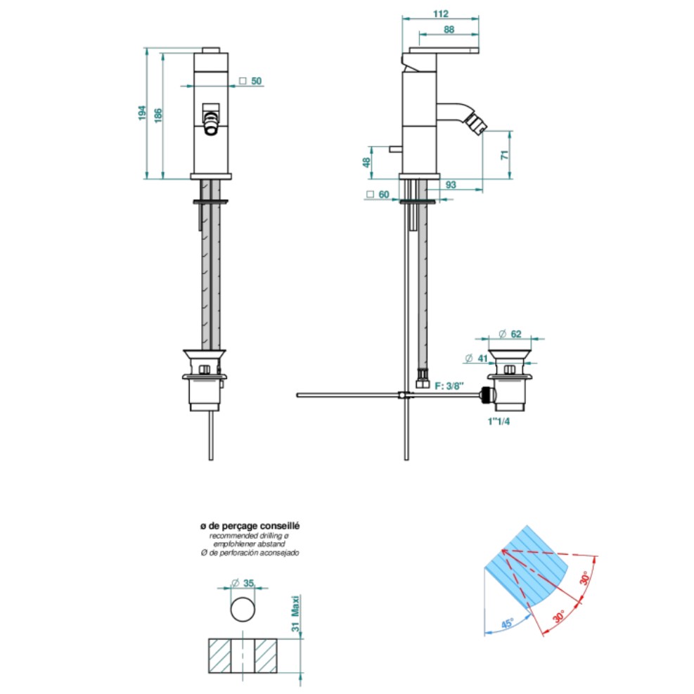 Single lever bidet mixer with waste