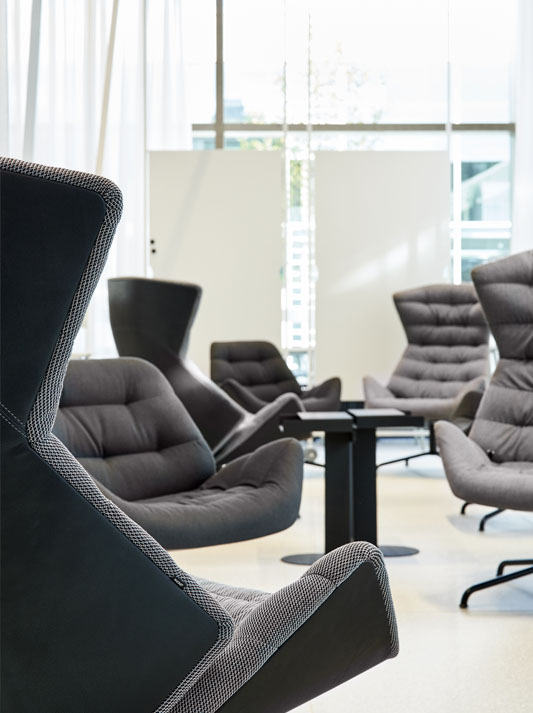 With the range 808, Munich based design studio Formstelle has created a lounge chair that combines maximum comfort with numerous possibilities for individualisation. The lounge chair 808 plays with the contrast between a protective shell and an inviting openness, creating a place of retreat and calm. Its distinctive appearance is created through a contemporary reinterpretation of the classic wing chair – the shape suggests an elegant cocoon that embraces the person sitting in the chair and communicates a feeling of security. Another striking characteristic is the comfortable upholstery with its welcoming soft wave effect. This inner cushioned core establishes an intriguing contrast with the angularity of the outer shell. A clever mechanism allows users to individually adjust the position of the chair. The compact lounge chair 809 functions as the “little brother” of the successful lounge chair 808, and as a place of retreat in smaller rooms or in groups, and in combination with the larger chair or the low side tables 1808 and 1809. A footstool rounds off the range.