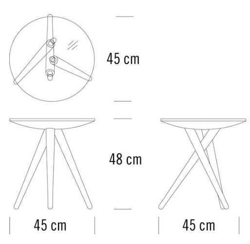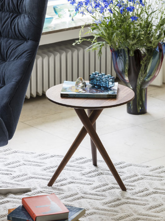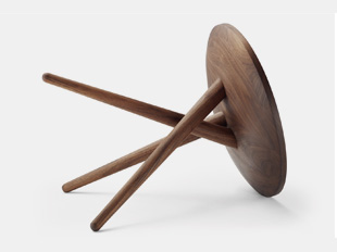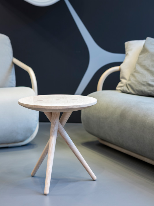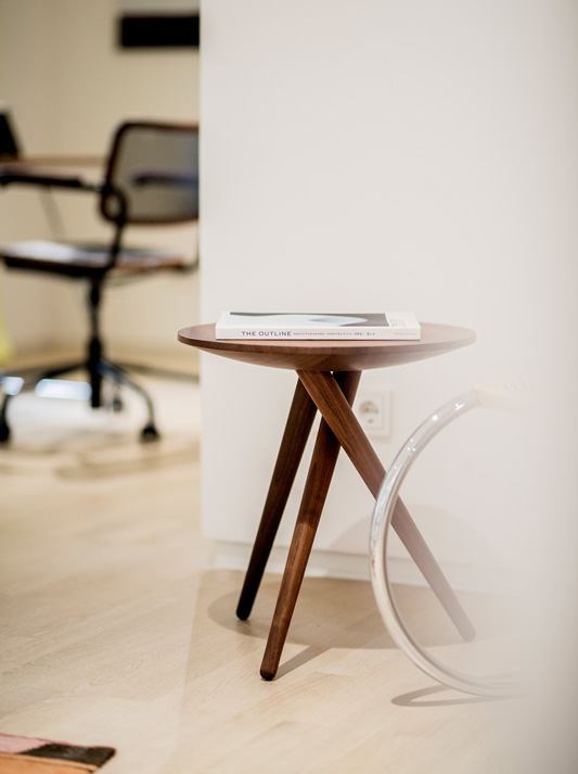The side table 1025 by James Van Vossel represents solid elegance and minimalistic essence: three wooden legs placed in regular 120-degree intervals outline an imaginary circle on the floor. On the surface of the tabletop they appear as perfectly aligned flush circles. The different grain pattern of the three table legs, which taper towards the bottom, creates an additional graphic effect contrasting with the tabletop. In addition to its function as a side table, this new model displays high-precision production quality – sophisticated technology meets masterful craftsmanship – and a distinctly sculptural look.