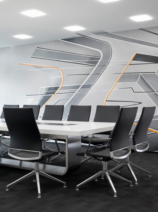 A sculpture in space: the conference table system S 8000 by architect Hadi Teherani combines high functionality with perfected quality and visual lightness. Like a ribbon, the elegant metal base bracket continues on the surface of the tabletop where it becomes a functional surface – the central element. Multimedia modules can be individually integrated. Cables run invisibly in the supporting base structure.