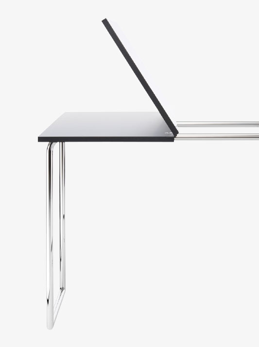 Console and table in one. The folding table B 109 was developed in an era when living rooms were much smaller than they are today. Folded up, it stands against the wall as a console with a depth of 45 cm. When needed, the panel is turned, unfolded and locked in place, resulting in a table with a tabletop size of 90 x 90 cm. B 109 is one of the tubular steel classics from the 1920s and 1930s. At the time, the collection by renowned architects was complemented with numerous in-house designs by Thonet.