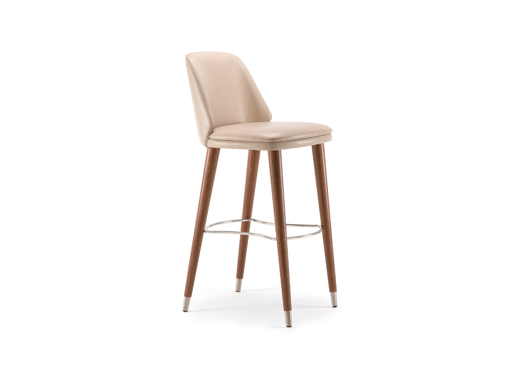 Grazie alla seduta e allo schienale sottili e alle coppette in metallo, losgabello da bar Meg ha una forma classica, in linea con le tendenze attuali.Anche se sottile, il sedile ha una comoda imbottitura e uno schienalegeneroso. Le gambe in legno sono dotate di un poggiapiedi in metallo perconsentire al cliente di sedersi comodamente, mentre fornisce allo sgabellouna struttura solida. La vasta gamma di tessuti disponibili e le finiture delegno lo rendono perfetto per arredare bar eleganti e di classe.